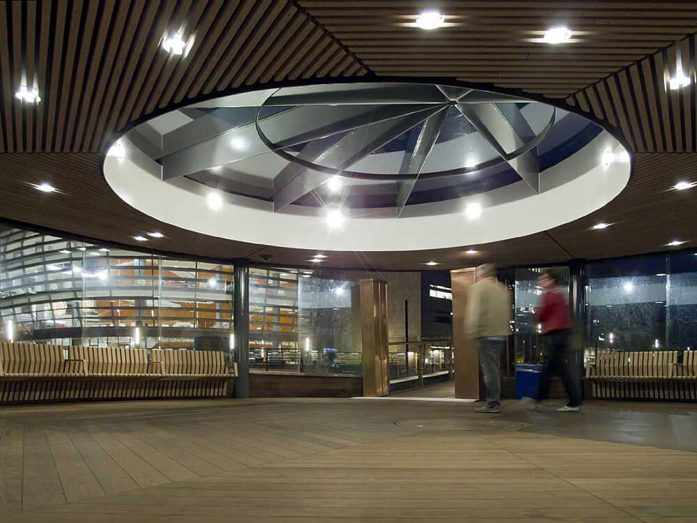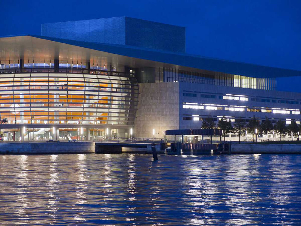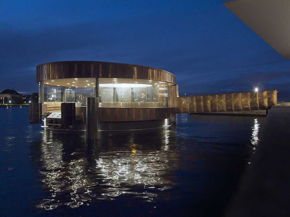 In the evenings, the copper pavilion is lit in a way which signals a welcoming and festive atmosphere, both to the harbour environment and the Opera.