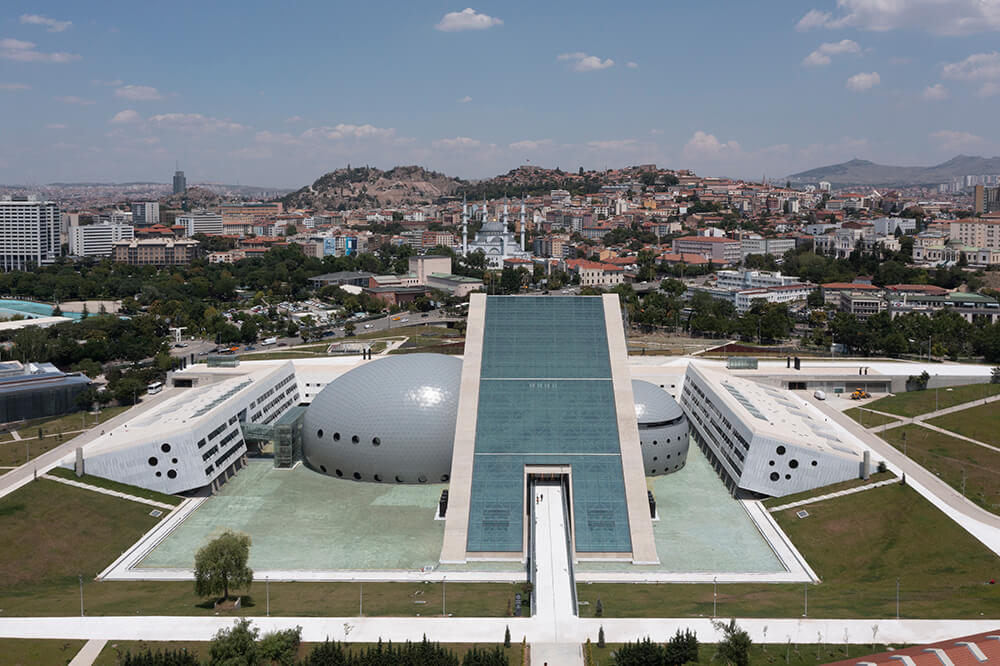 The Presidential Symphony Concert Hall lies in the heart of the city, right in the middle of an axis connecting the historic Ankara Castle and Anıtkabir, the Mausoleum of Mustafa Kemal Atatürk (the founder of Turkish Republic). It is embedded in a relatively abandoned urban landscape, which is the only gap looking towards Anıtkabir and the historic Ankara Citadel from Ataturk Boulevard, which functions as the main avenue since the first urban plans of Ankara. The decision was to avoid interrupting the views of both the Citadel and the Mausoleum. The project stood out among other competition entries with two prominent features: One is this subtle symbolism concerning the dialogue of the premodern and modern-republican histories of the city. The design strategy prioritizes vistas of both monuments and establishes the dialogue by being a contemporary cultural destination in between. The second concerns the timeless form and spatial qualities of the complex. According to the jury report, the building reveals a symbolic architecture that will not wear out over time, avoiding a design language that can be valid for a certain period of time.
