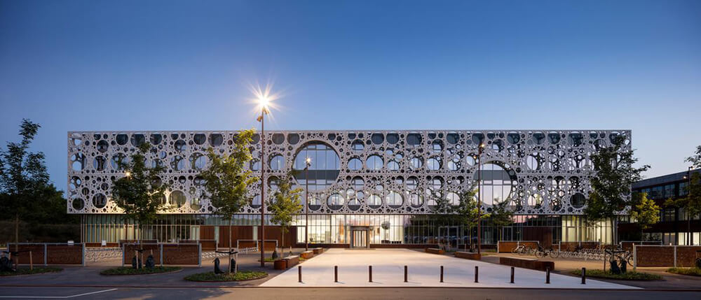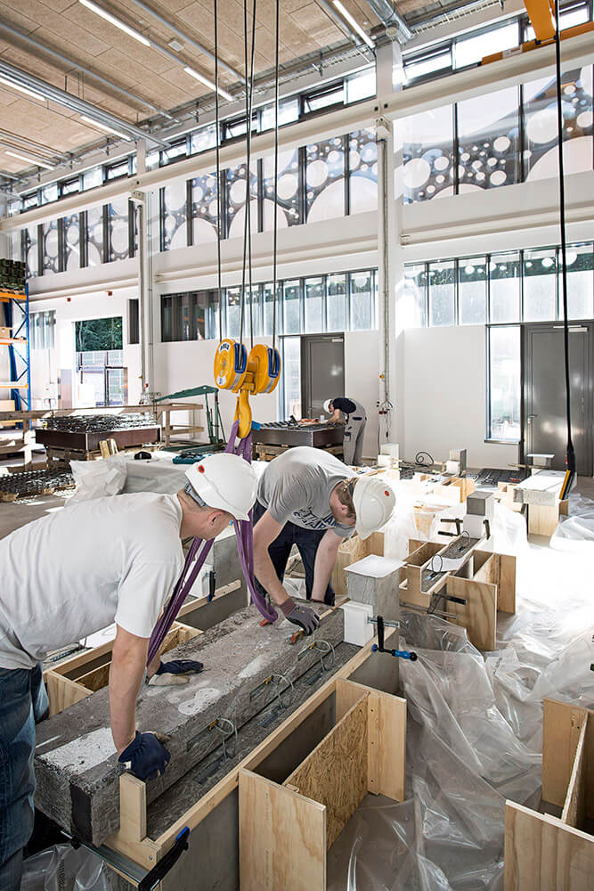 The eye-catching screen reflects the innovation and creativity that characterises the various institutes which it unites, including institutes for diverse research on the subject of construction technology and industrialization. Here, the fiber-reinforced concrete architecturally demonstrates the possibilities of new materials.