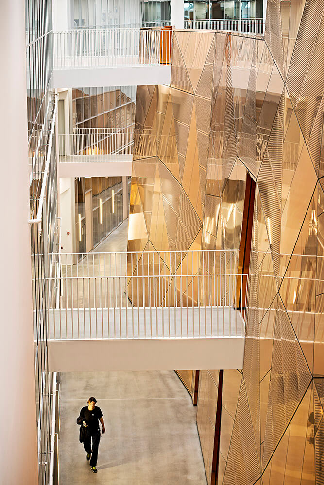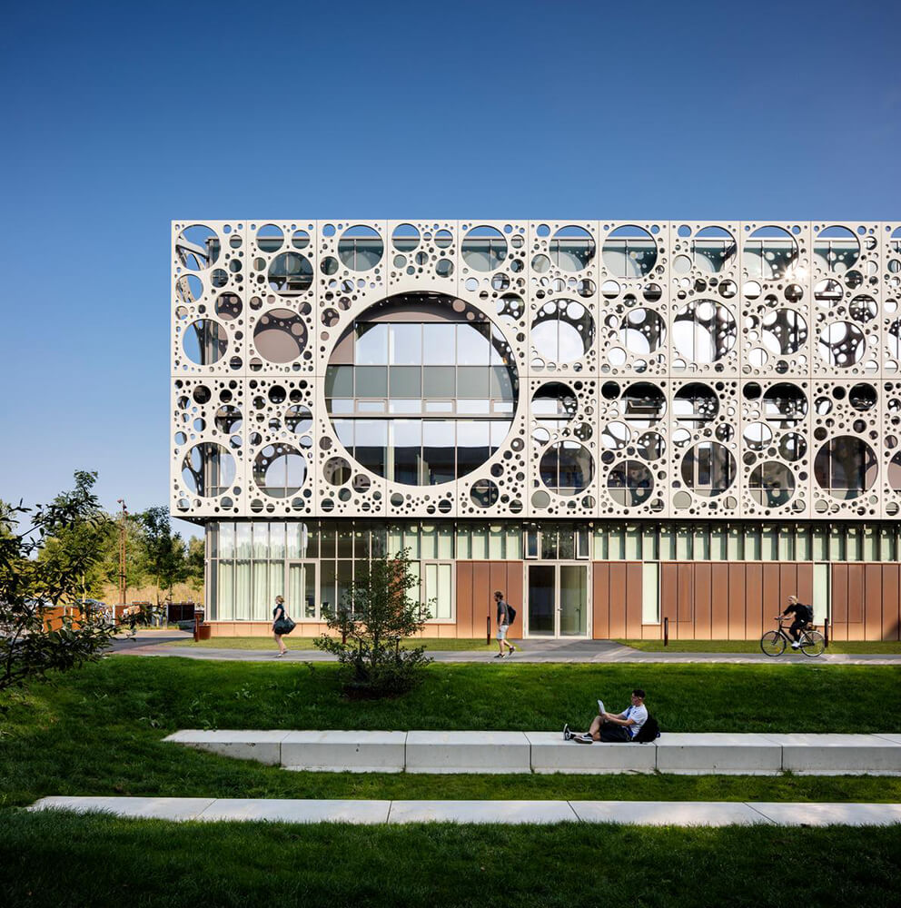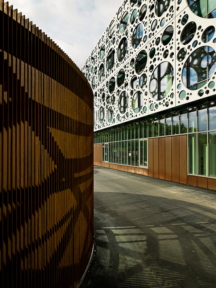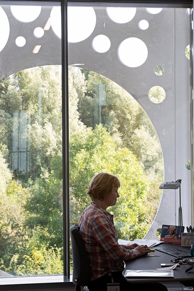 The composition of the façade screen is created from only seven different types of concrete panels, and the different diameters and layouts of the panels’ perforation patterns have been optimized to act as a solar screen and glare protection, reducing direct sunlight by up to 50 percent, while still allowing unobstructed views from all interior spaces to the green surroundings.