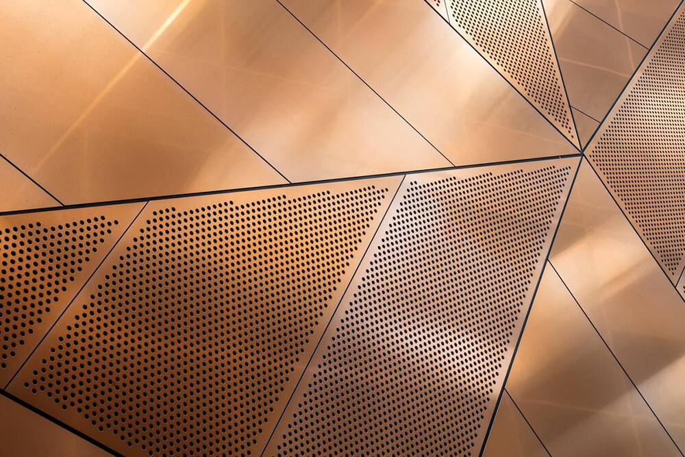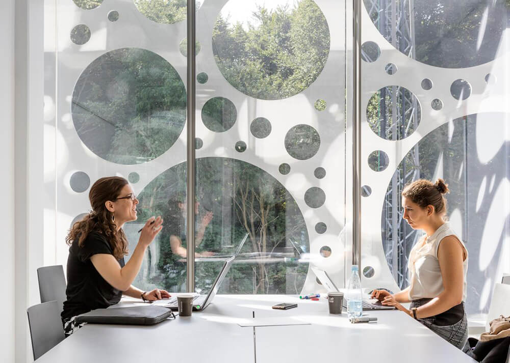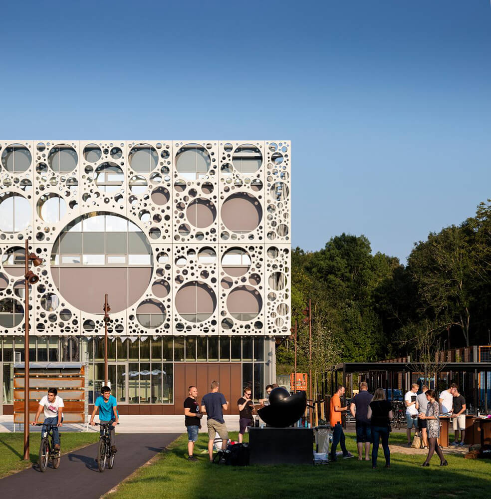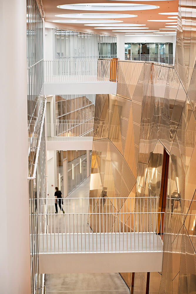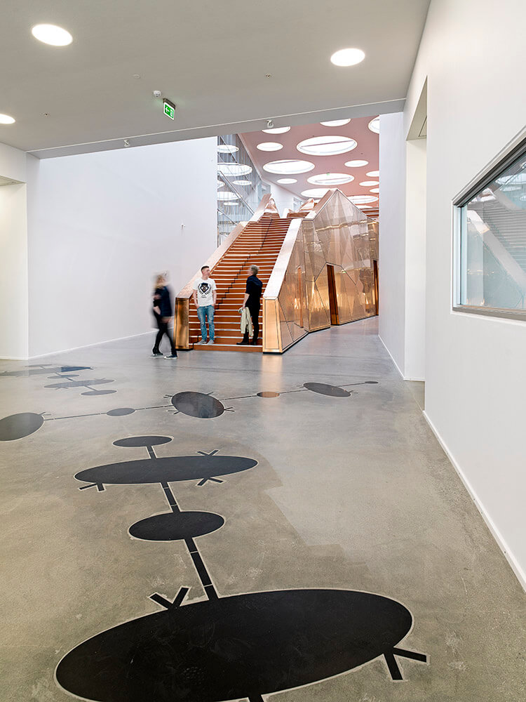 The composition of the façade screen is created from only seven different types of concrete panels, and the different diameters and layouts of the panels’ perforation patterns have been optimized to act as a solar screen and glare protection, reducing direct sunlight by up to 50 percent, while still allowing unobstructed views from all interior spaces to the green surroundings.
