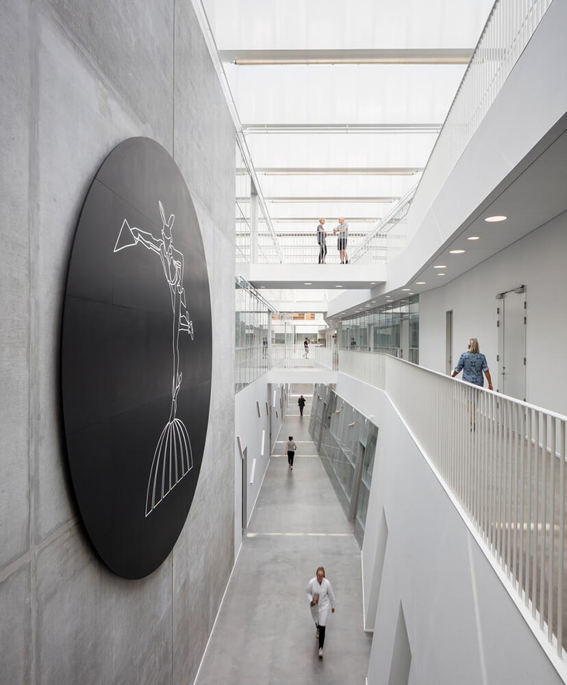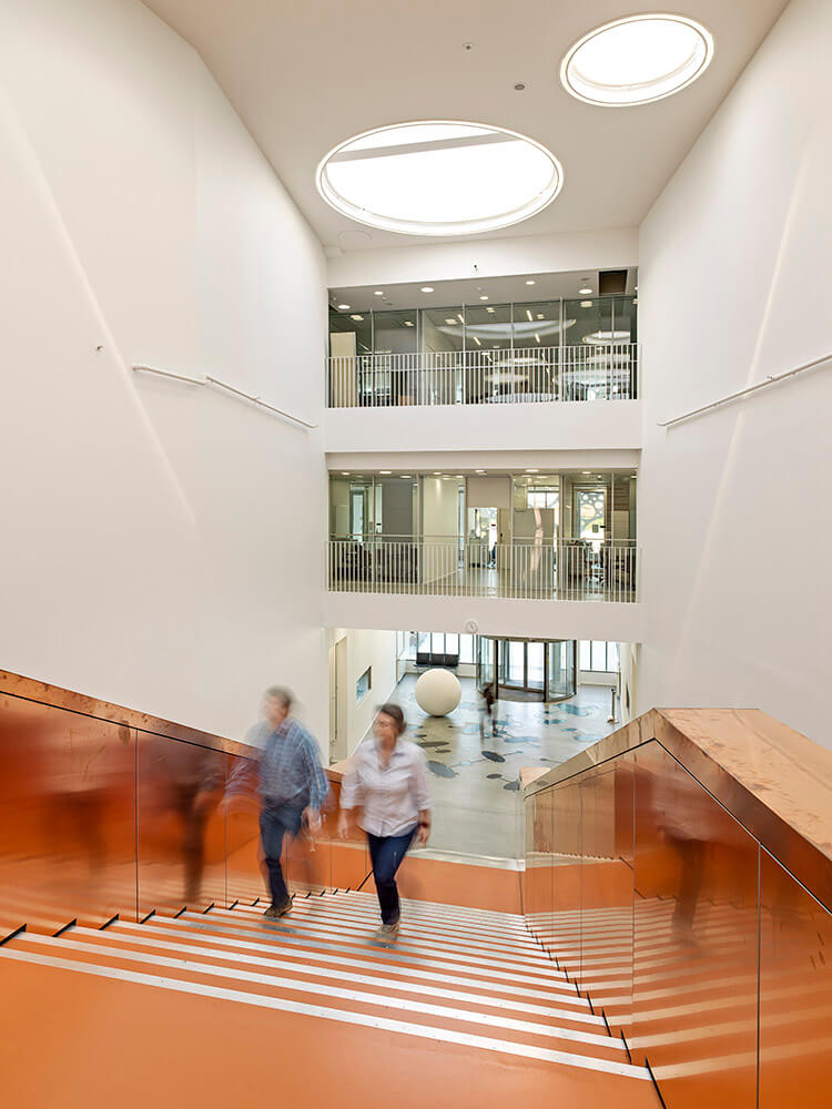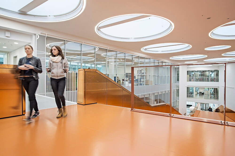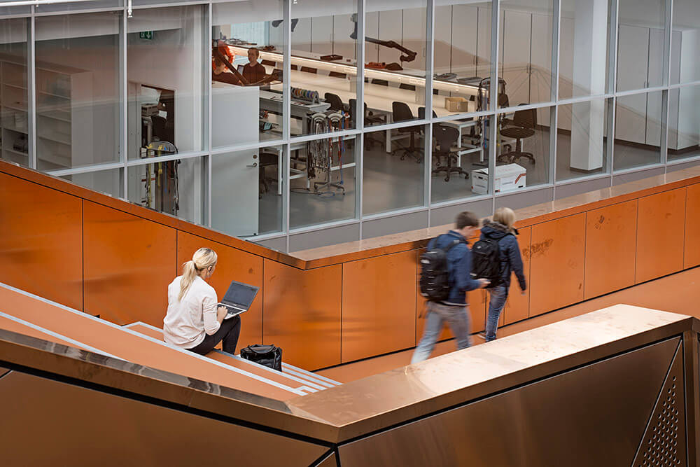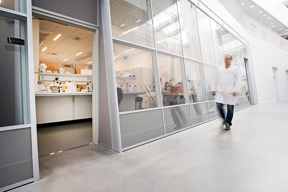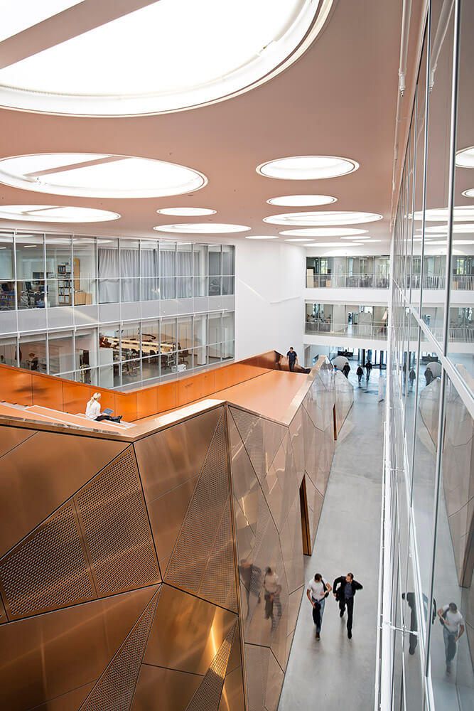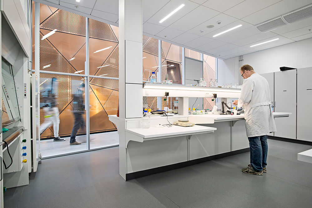 The four institutes sharing the building are conducting world-class research in various fields such as material and construction science, nano-optics, environmental sciences and robotics. As a result, the building houses several spectacular pieces of equipment such a one of Denmark’s largest distillation plants, vibration-free and climate-controlled laser optics labs and a special ultra-high strength concrete slab for testing structural loads.