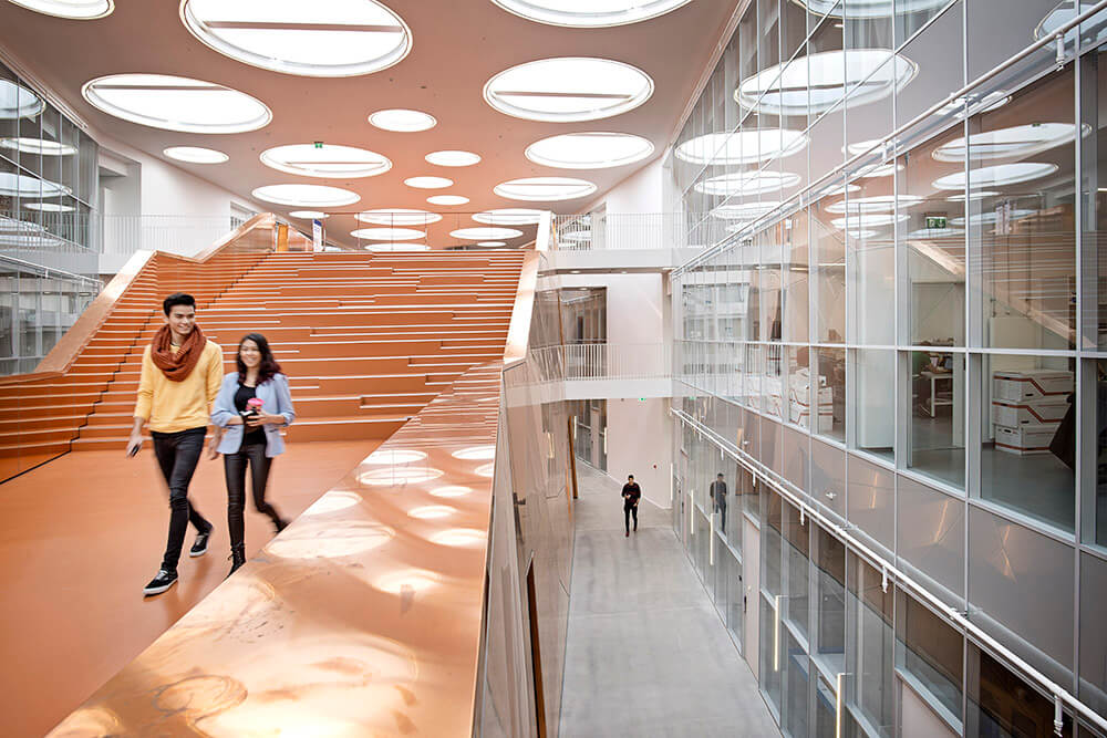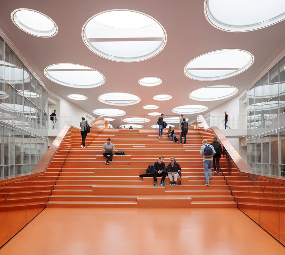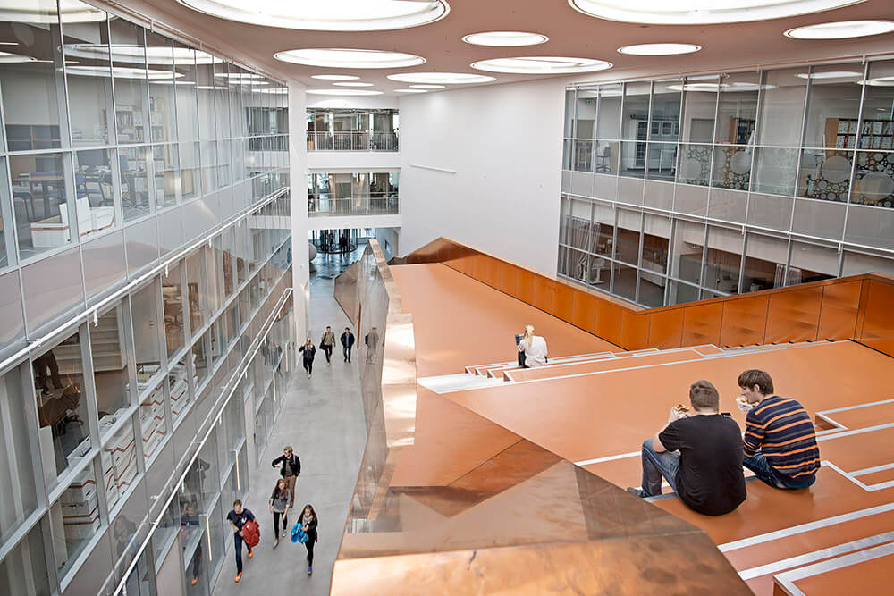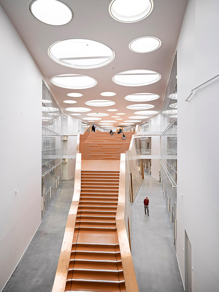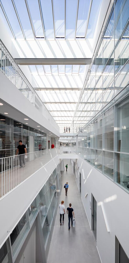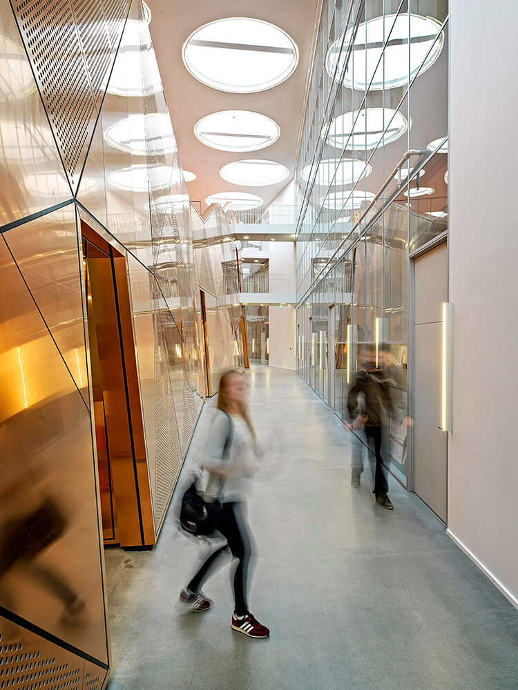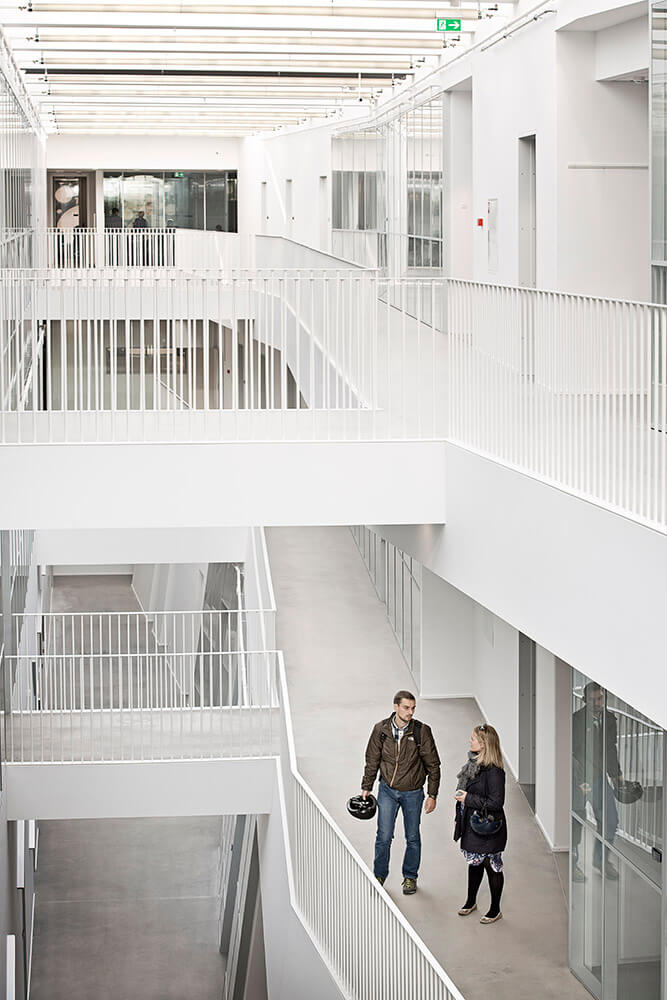 The Technical Faculty is part of the University of Southern Denmark (SDU) in Odense, and constitutes a shared research and education environment for four different institutes. The building is designed as one big envelope consisting of 5 buildings connected by bridges at multiple levels crossing the heart of the complex, a “piece of furniture” containing common functions, meeting-rooms and café/lounge areas. The many connections allow for more fluid boundaries, and more community and knowledge sharing.