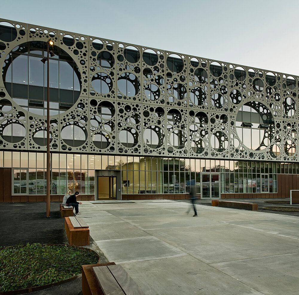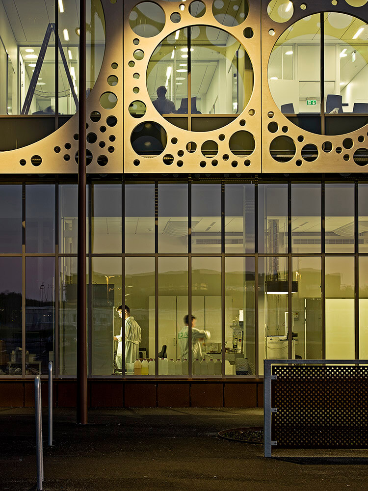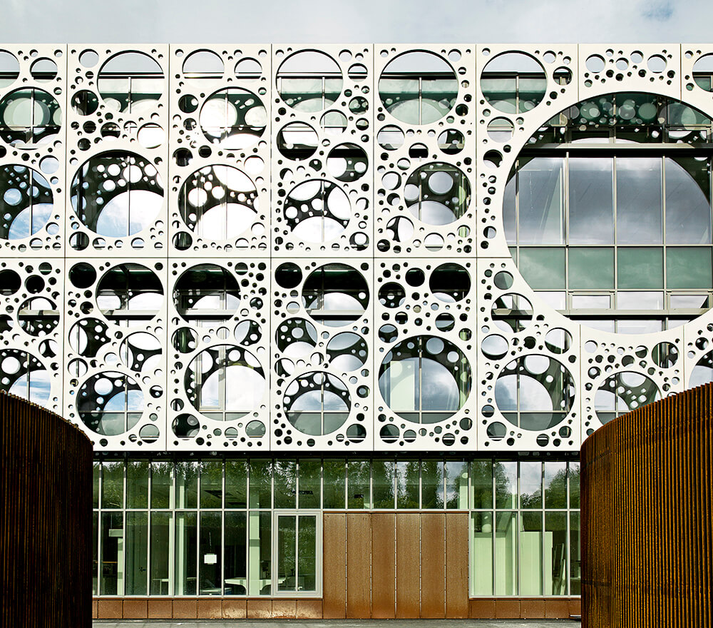 The building is designed as a glass house with an external screen or veil revealing and shading the glazing. The elegant and seemingly weightless screen is made from pre-fab panels of white CRC concrete (Compact Reinforced Composite, a special type of Fibre Reinforced High Performance Concrete with high strength) featuring circular openings with an underlying solar screen and natural ventilation.