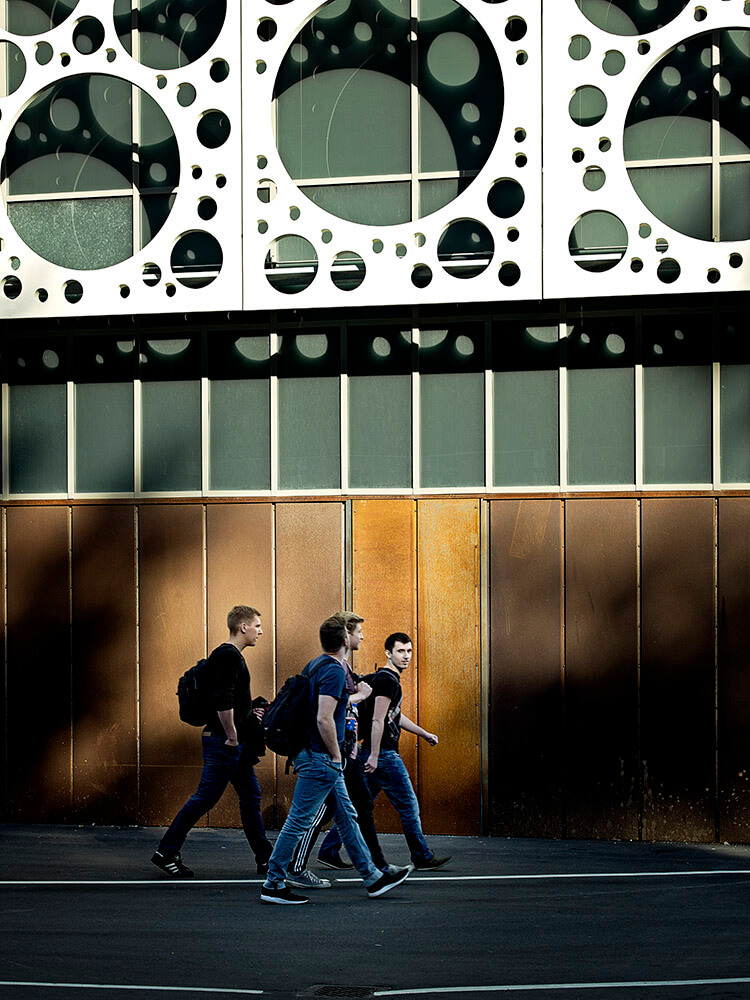 The unusual appearance is a result of both adaption and distinctiveness in relation to the existing campus, which is a unique 1970s structuralist design by architects Krohn & Hartvig Rasmussen characterized by its linear layout and brutalist use of fair-faced concrete and weathered cor-ten steel cladding. The new Technical Faculty building adopts the same materiality and site layout, but reinterprets their use and appearance to clearly set the building apart from the historic campus architecture.
