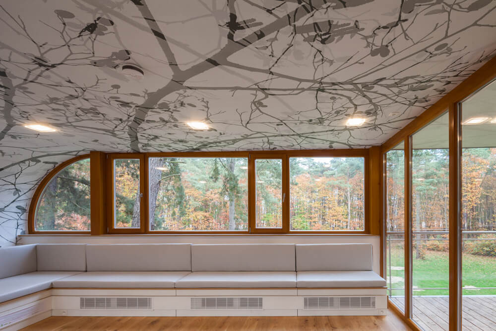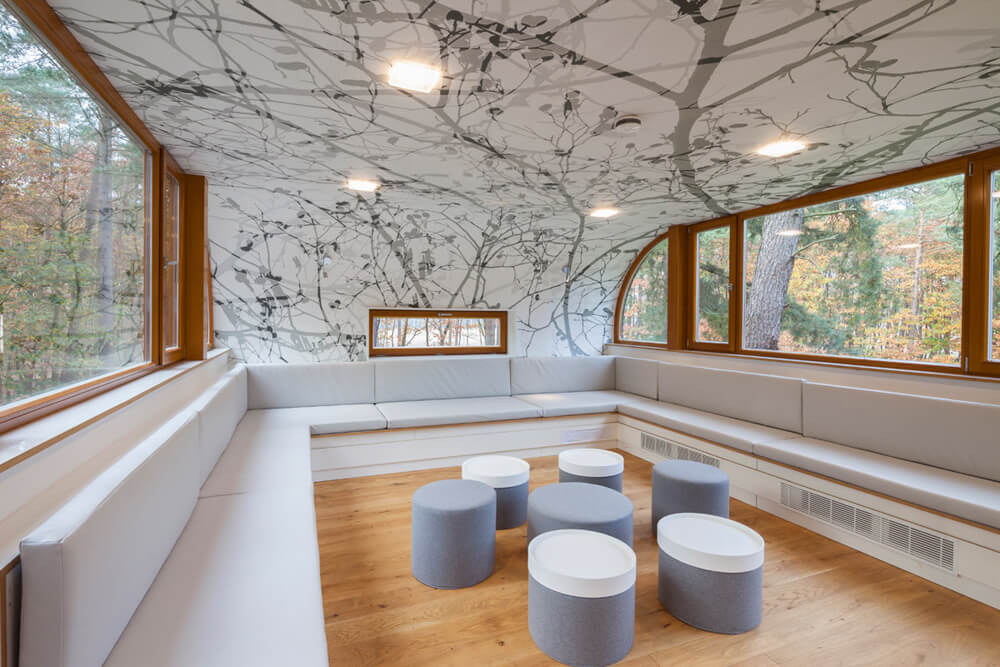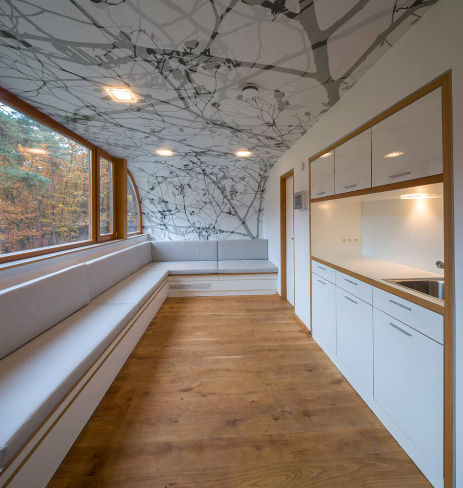 In the lower cabin is a coffee lounge, pantry, restroom and technology room. The upper room is dedicated to meetings and other events that are appropriate to this exquisite space among the trees. Benches covered with soft pillows surround the space resulting in a comfortable and laid-back feeling, encouraging one to stay longer.