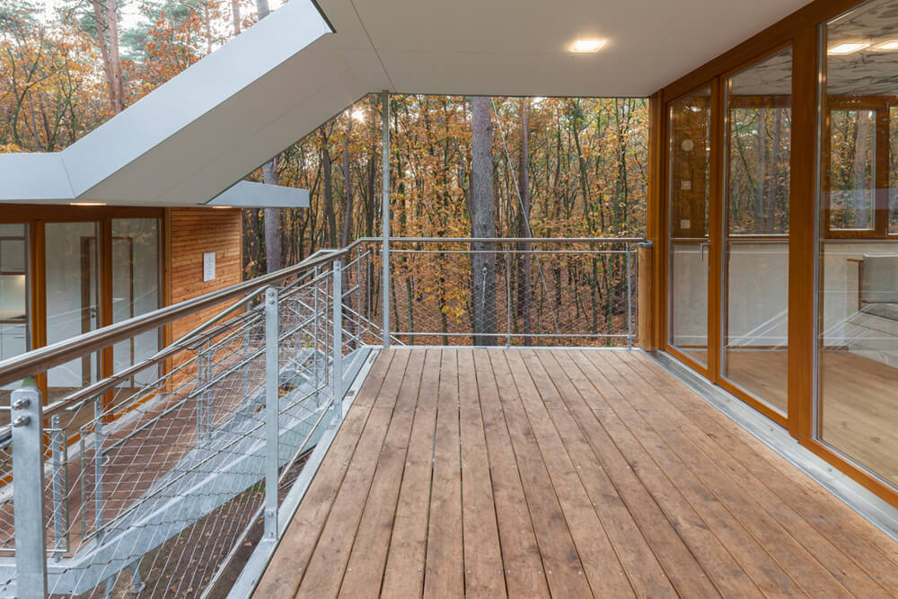 The cabins and upper terraces rest on 19 angled steel stilts. Each steel stilt is connected to the ground below with foundation screws that have a minimal impact on the forest floor.