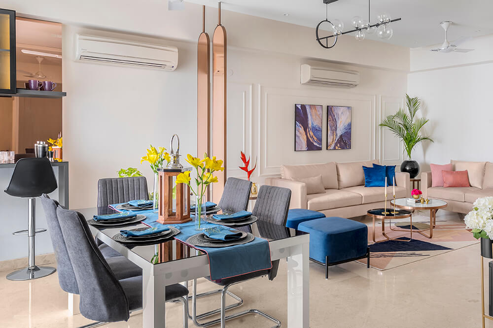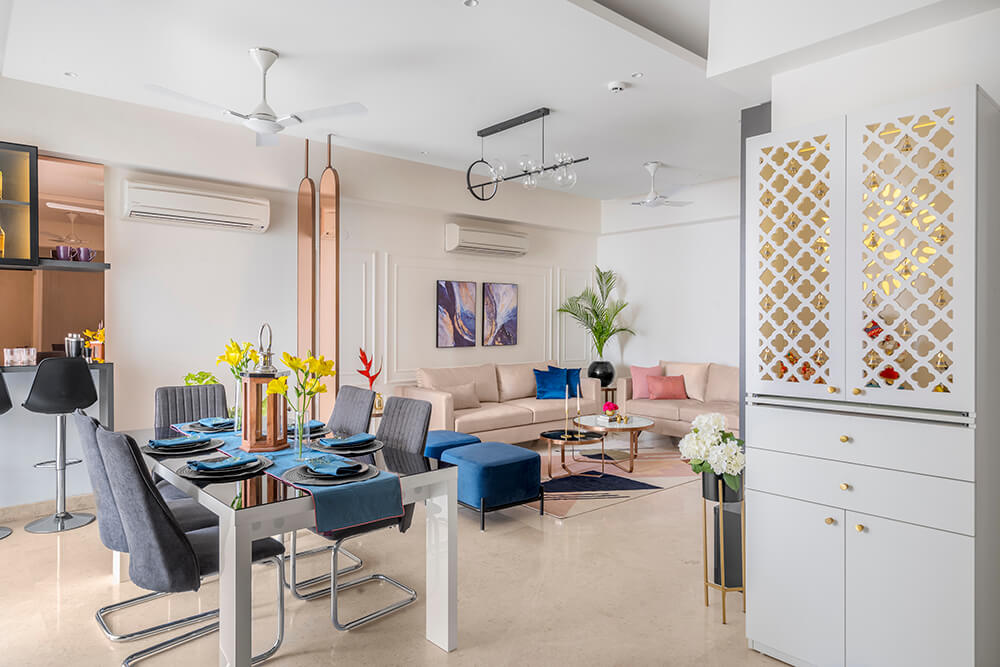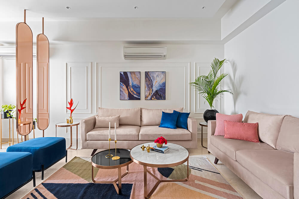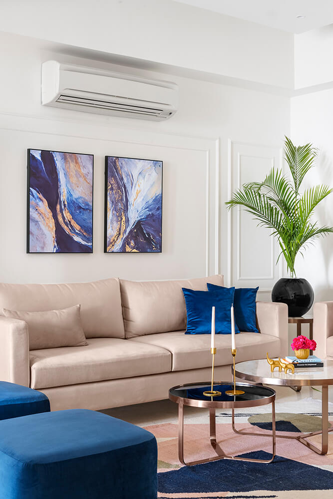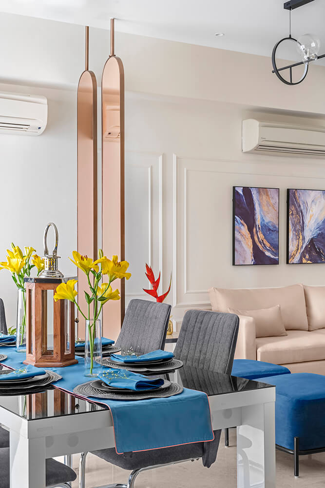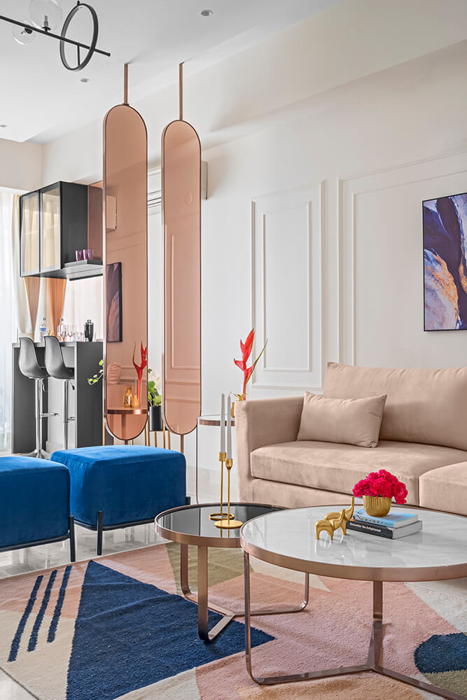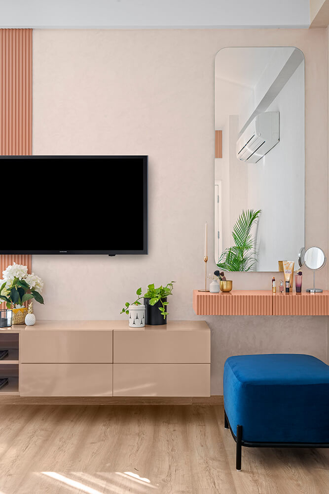 Immediately upon entering the home, one is welcomed into the living room which is set in soft pink shades. The softness is balanced by the dark tones of a backlit entertainment unit. Standing across the room from the couches, it comprises a TV and shelves displaying the family’s collection of art. A geometric patterned rug beneath the nesting coffee tables brings a contemporary twist to the space vis-à-vis the classical wall trims behind the sofa. Vivid blue ottomans and wall art set off the blush tones dominating the space.