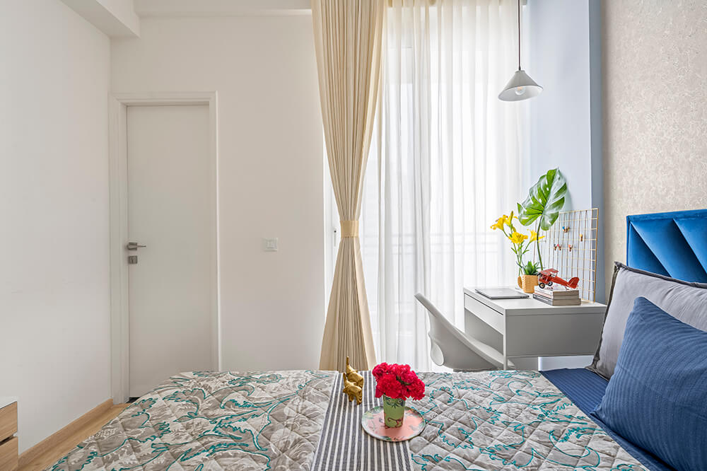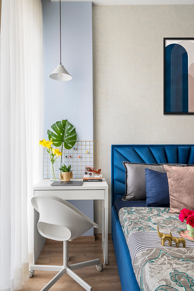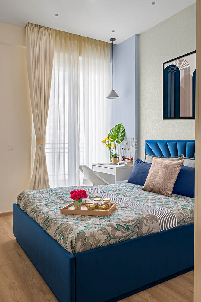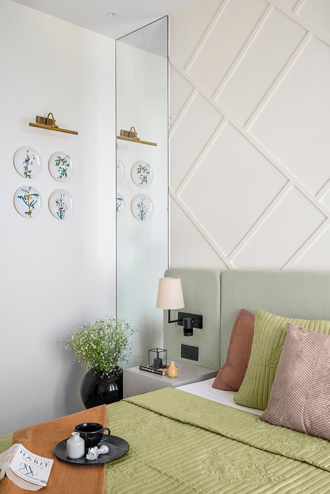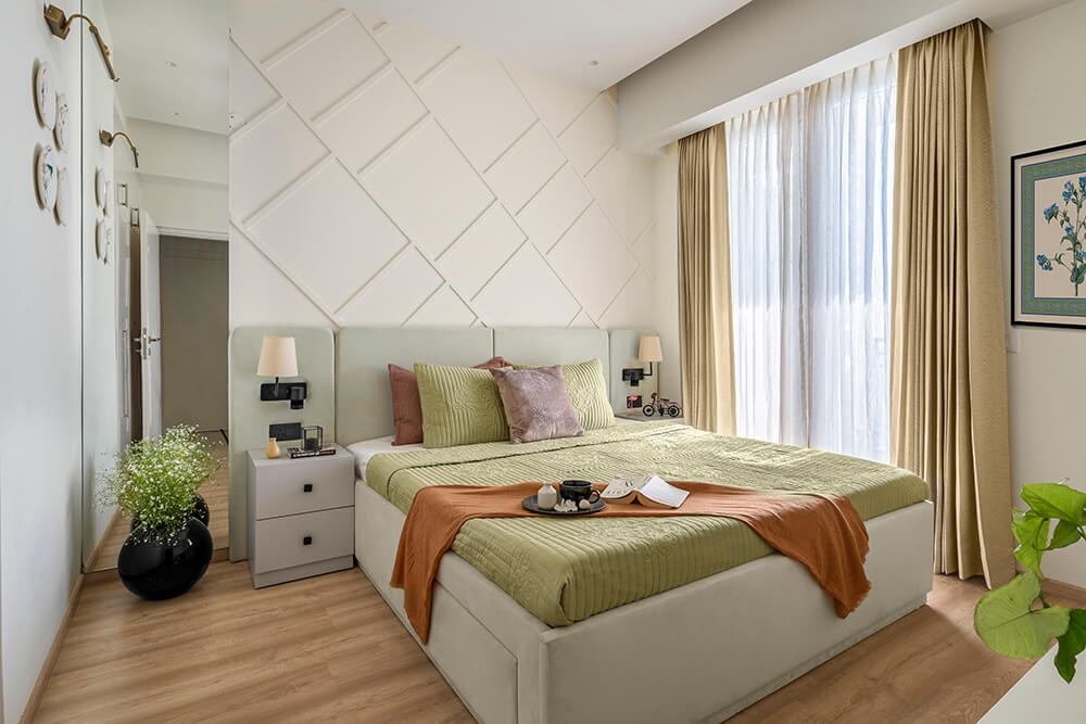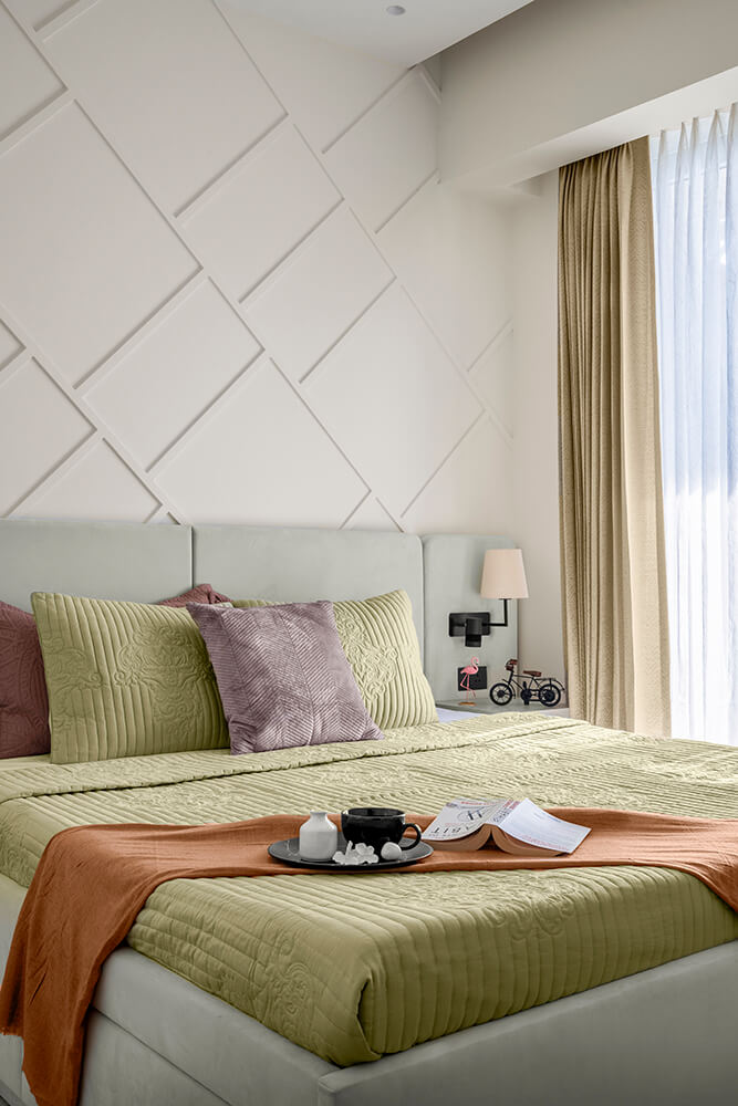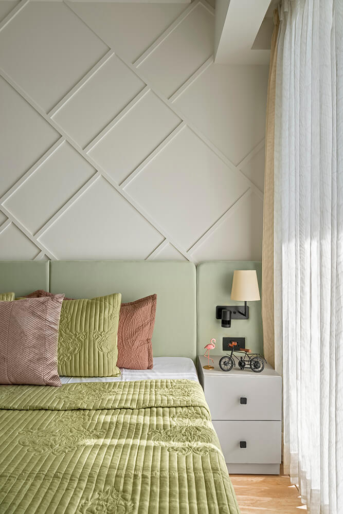 The guest bedroom is dominated by varied shades of blue, colouring the bed frame in a vibrant hue, and shifting to a powder blue on the back wall. The delicately textured wall serves as a serene backdrop for the starburst patterned headboard. In contrast, most of the millwork is finished in a milky white palette. A simple lamp hangs over the work corner that looks out over the balcony and is illuminated by daylight filtering through sheer curtains. The second guest bedroom is tastefully washed in a sage green colour that takes centre stage in the furnishings. A floor to ceiling mirror faces the entrance to the room, visually drawing out the space from its physical bounds. A rounded-corner headboard in a pistachio shade stretches out to the far edges of both bedside tables, hosting panel attachments for bedside lamps and switchboards in stark black. Over the headboard, the entire wall features trims in an angled pattern, adding a unique design element to this room while simultaneously tying into the rest of the home.