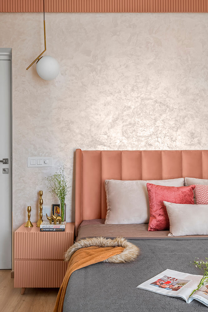 While the common areas speak of a mature and sophisticated sensibility, the bedrooms explore the couple’s more adventurous side with each room experimenting with its own predominant theme. The furniture and fixed cabinetry was designed and made in-house to achieve the aesthetics envisioned for the space. Upon first entering the master bedroom, one is greeted by an expanse of coral. A fluted wall panel reaches down from the ceiling to a lean TV console which extends along the wall which then steps up a level to create a floating vanity. The fluted coral fascia also details a contemporary crown moulding above the bed. The bedside tables tie into the dynamic use of fluted panels across the room and customised textured paint and upholstery bridge the gap between the different elements of the rich, yet calming colour scheme.