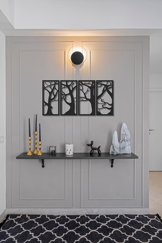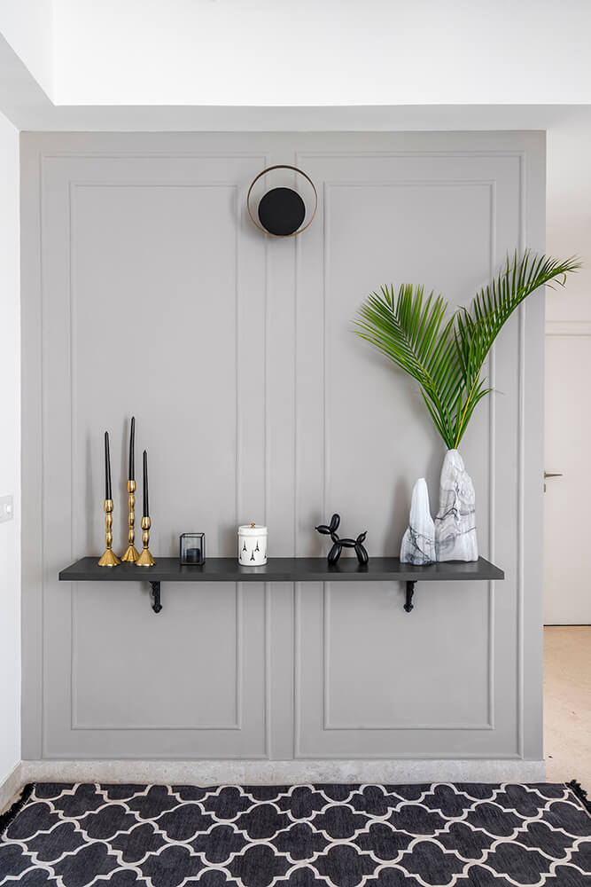 The layout enables easy circulation and achieves a balance of volume through an expert choice of colours, finishes and textures. Echoes of material and tones extend throughout the space, bringing together all of the varied spatial elements. Straight lines punctuated by curved forms in panelling and furniture profiles add to the quirk of the space, also brought in by the artwork displayed around the house. In its carefully experimented aesthetics, the residence represents the urbane, cosmopolitan outlook on life of the young family it is designed for.