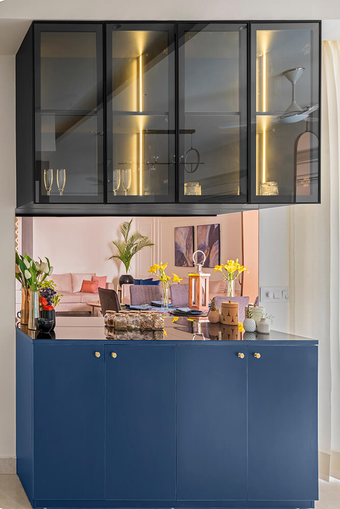 Past the seating arrangement, a partition of rose-tinted mirrors held in gilt metal frames visually separates the entire volume into the living and dining areas. The floor to ceiling installation acts more as an art piece than a physical barrier, lending a cheery temperament to the space. In the dining area, set around a back-painted glass topped table, stands a bar unit and a display cabinet in dark tones consistent with the entertainment unit. The bar anchors the space with high chairs that can be used to sit and enjoy the sweeping outside views with a drink in hand. The backsplash in both units is finished with rose-tinted mirrors that continue the theme from the partition, offering splashes of chrome as accents in the soft colour palette of the space. Gossamer white drapes diffuse the daylight flooding the common areas, accentuating the spaciousness of the rooms – a quality which is also realized through an artful play with heights and proportions.