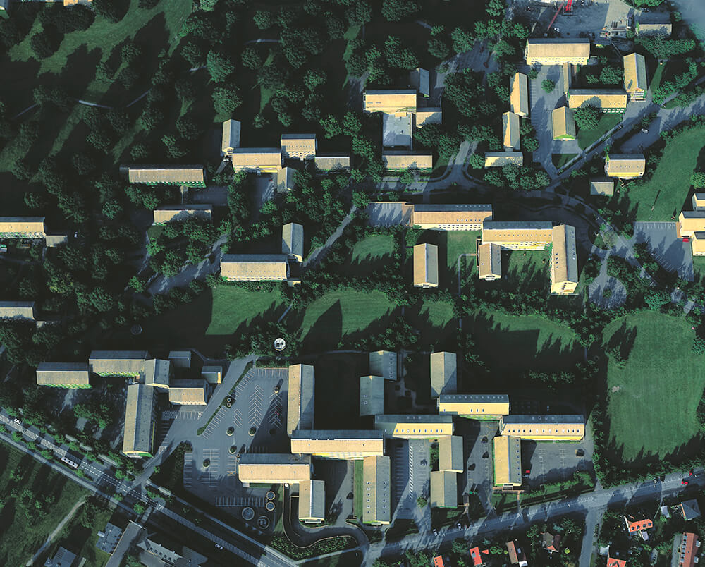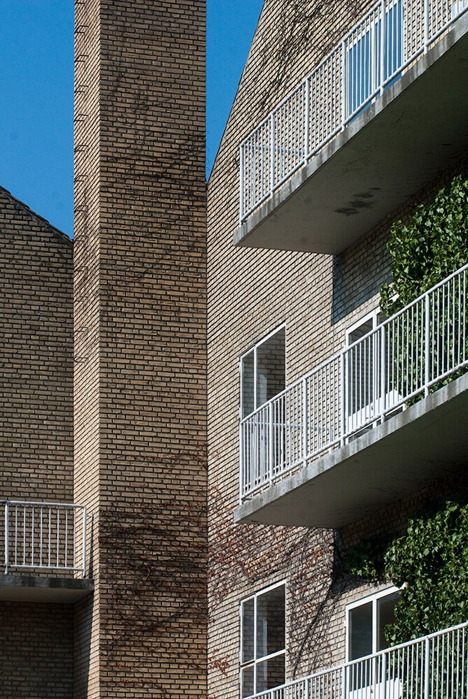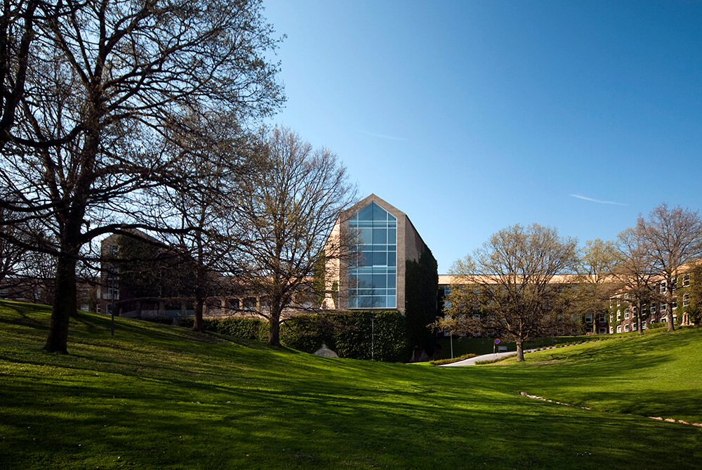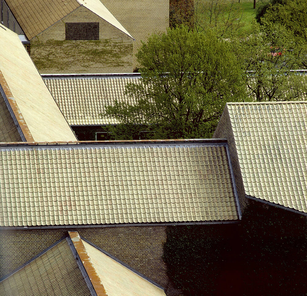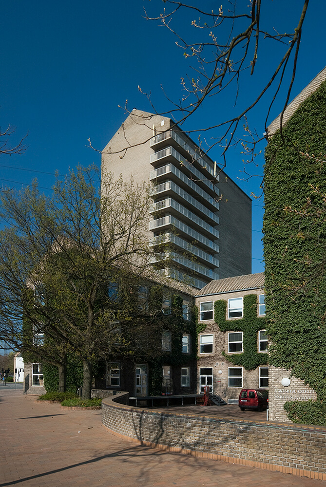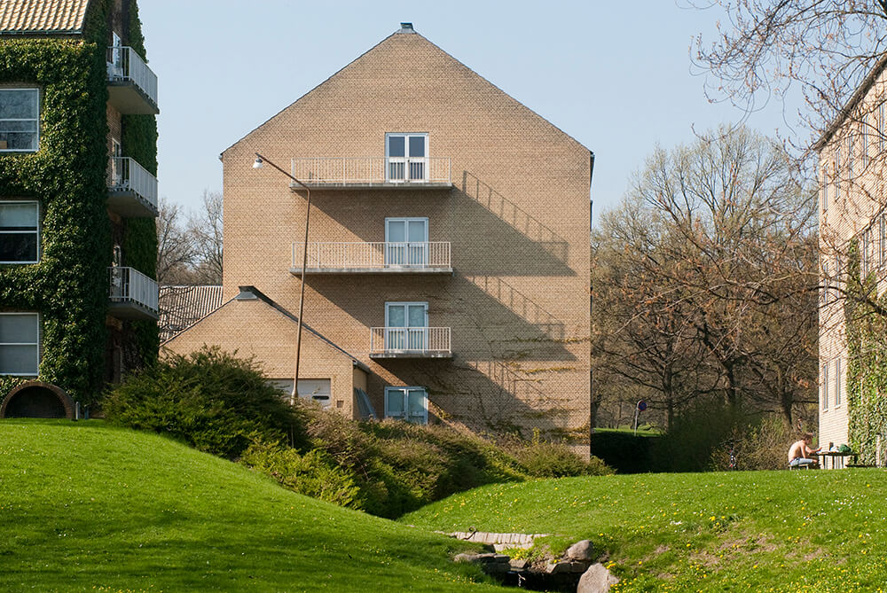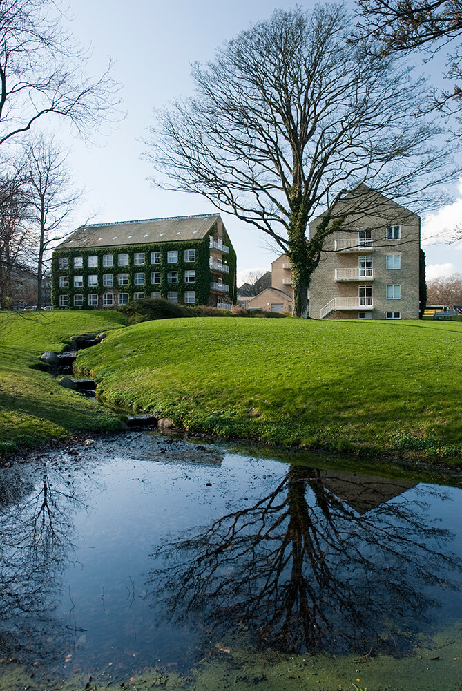 The University of Aarhus, with its extensive park in central Aarhus, includes teaching rooms, offices, libraries, workshops and student accommodation. The university has a distinct homogeneous building style and utilises the natural contours of the landscape. The campus has emerged around a distinct moraine gorge and the buildings for the departments and faculties are placed on the slopes, from the main buildings alongside the ring road to the center of the city at Nørreport. All throughout the campus, the buildings are variations of the same clear-cut prismatic volume with pitched roofs, oriented orthogonally to form individual architectural clusters sharing the same vocabulary. The way the buildings emerge from the landscape makes them seem to grow from it, rather than being superimposed on the site.