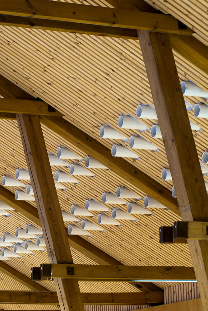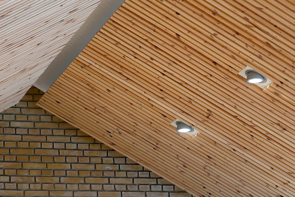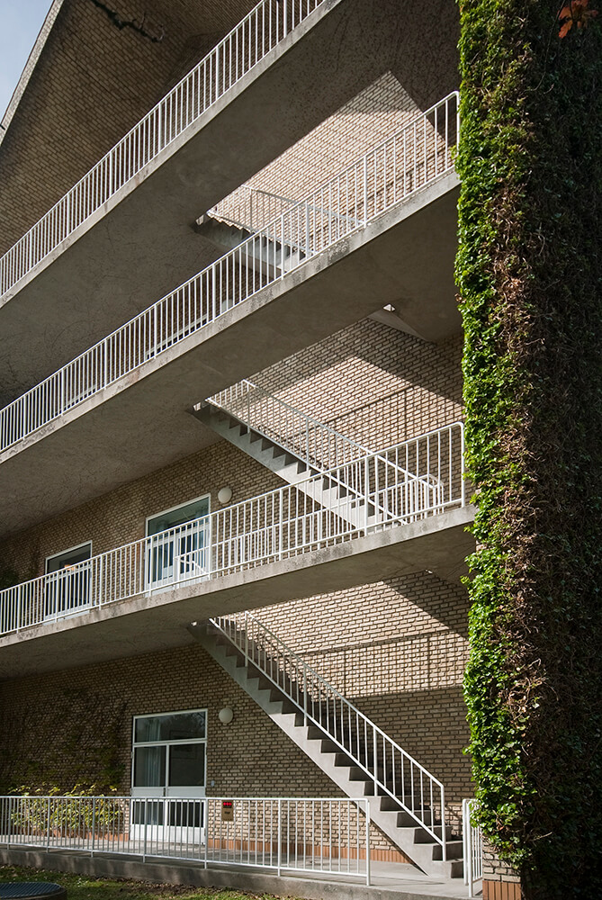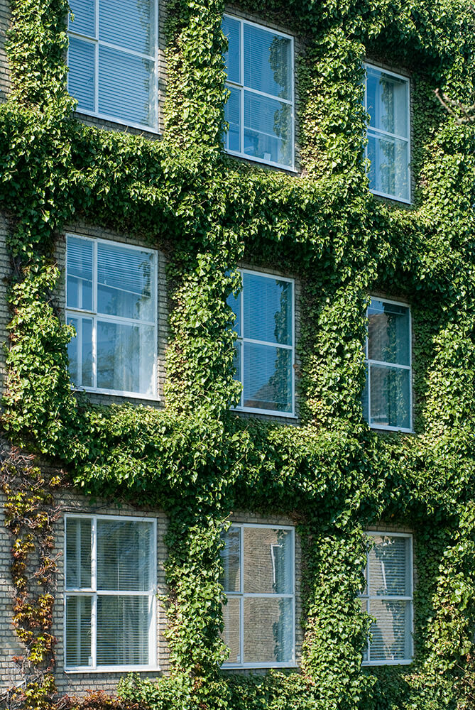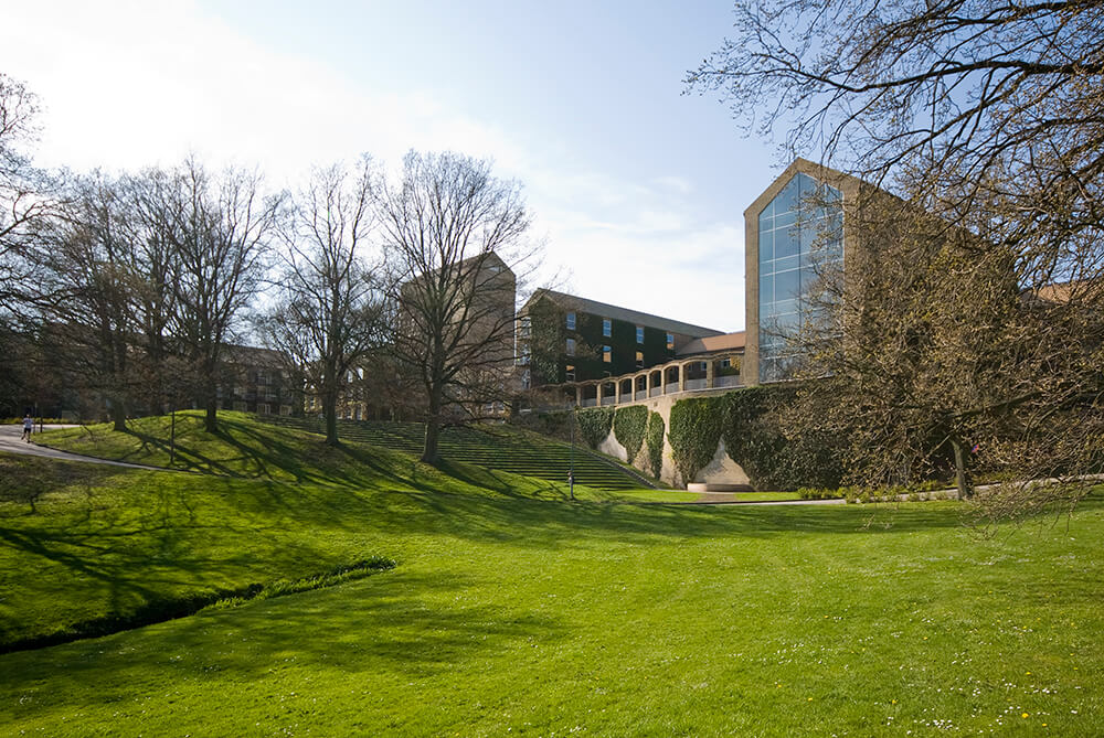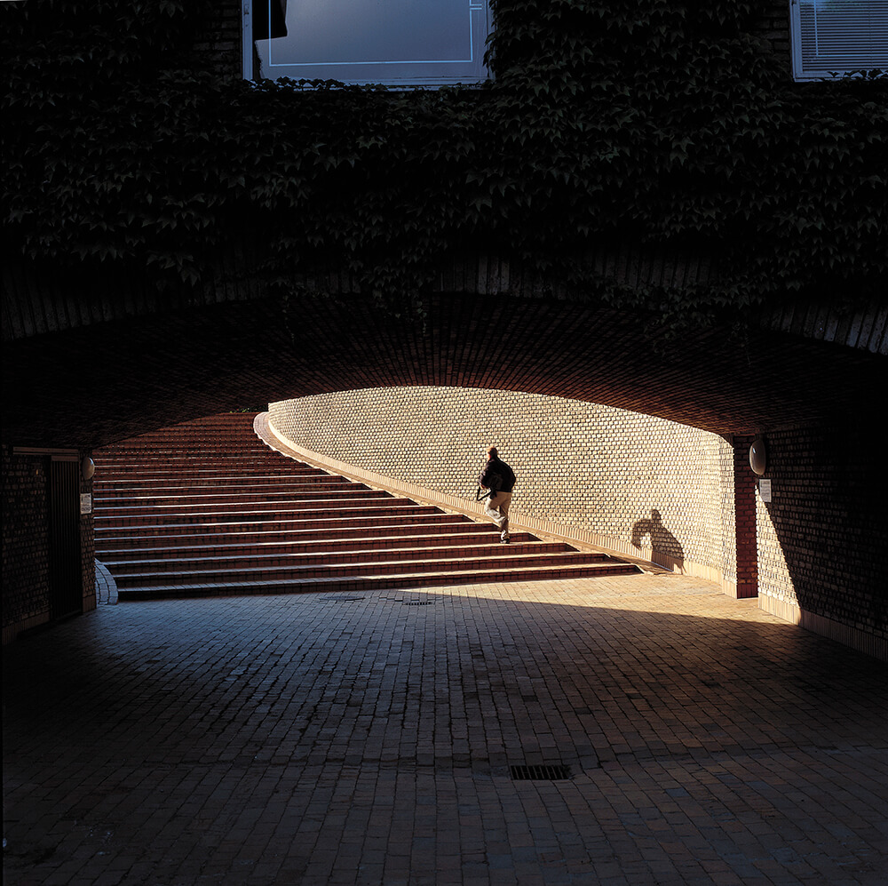 The University of Aarhus, with its extensive park in central Aarhus, includes teaching rooms, offices, libraries, workshops and student accommodation. The university has a distinct homogeneous building style and utilises the natural contours of the landscape. The campus has emerged around a distinct moraine gorge and the buildings for the departments and faculties are placed on the slopes, from the main buildings alongside the ring road to the center of the city at Nørreport. All throughout the campus, the buildings are variations of the same clear-cut prismatic volume with pitched roofs, oriented orthogonally to form individual architectural clusters sharing the same vocabulary. The way the buildings emerge from the landscape makes them seem to grow from it, rather than being superimposed on the site.
