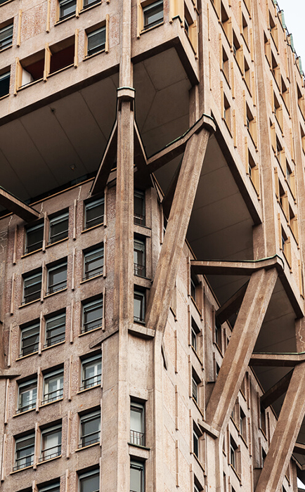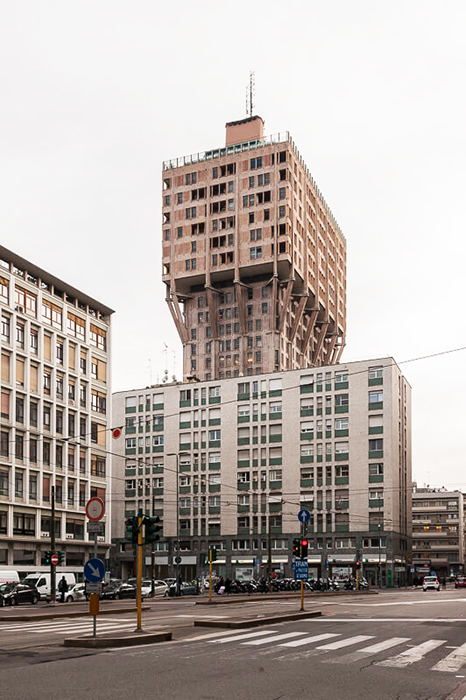 The lower parts used to be more narrow in such fortresses, while wooden boards or stone beams were the elements fron which the higher parts propped up. As a consequence, a result of a modern interpretation of the typical Italian medieval castle is the shape of this building. At the same time, the functional needs of space were satisfied in this building from BBPR. These were narrower surfaces on the ground, wider and more spacious ones on the top floors. Specific volumes, according to the buildings’ purpose, were imposed by the town planning laws. In this tower, the latter were the mixed functions of residential and commercial use.