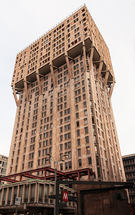 Italian modern architecture is the context in which Velasca Tower belongs to. It is also while still part of the Milanese context in which it was born, including the Milan cathedral and the Sforzesco Castle. The tower has a height of approximately 100 metres and a peculiar and characteristic shape. It looks like a “mushroom”. It is a member of the city skyline, along with domes, buildings and other towers. The structure of the tower is a reminder of the Lombard tradition, made of medieval fortresses and towers, each having a massive profile.