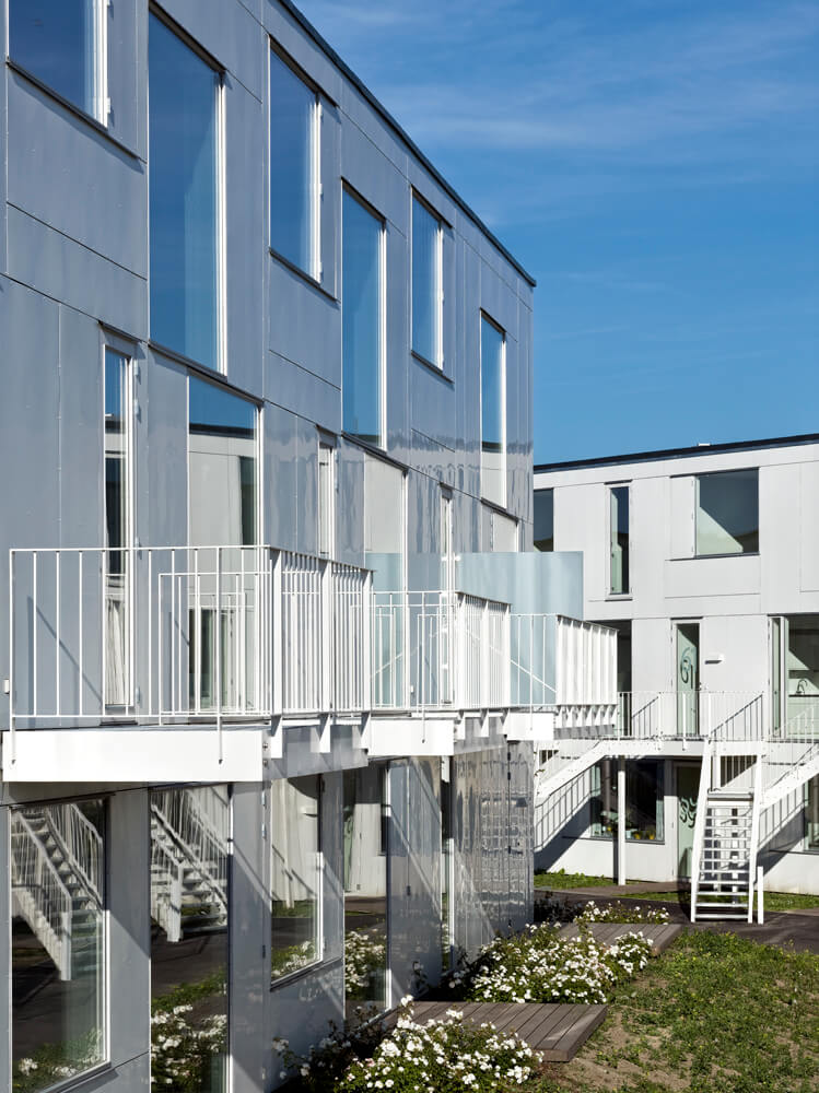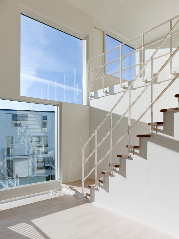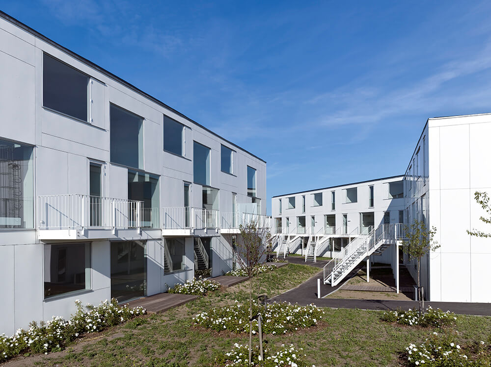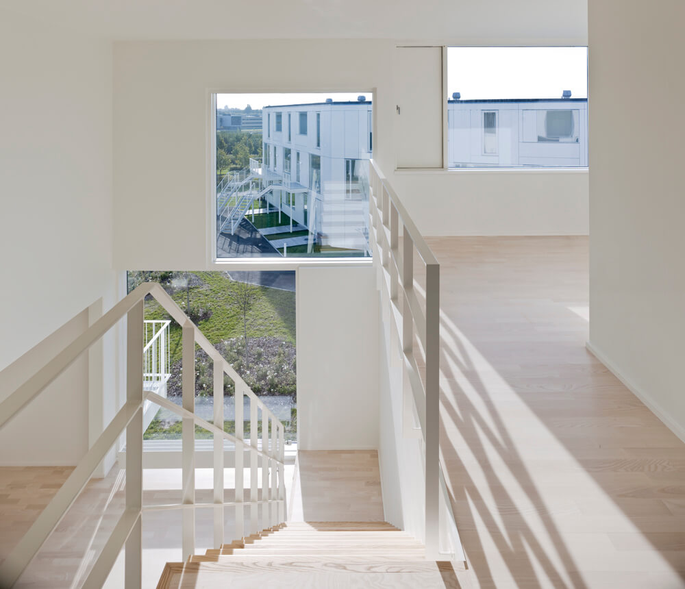 The complex is characterized by a lightness found in the crispness of the façade cladding, the intricately patterned individual staircases, the white-blossomed cherry trees, and white rose plantings that run throughout the landscape.