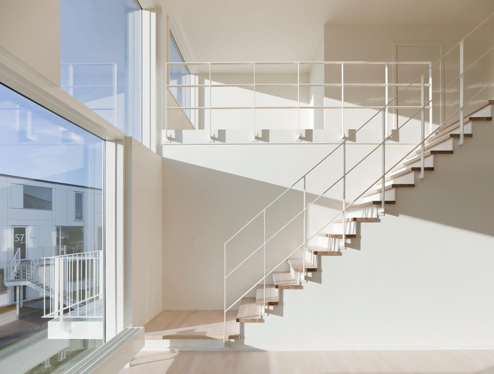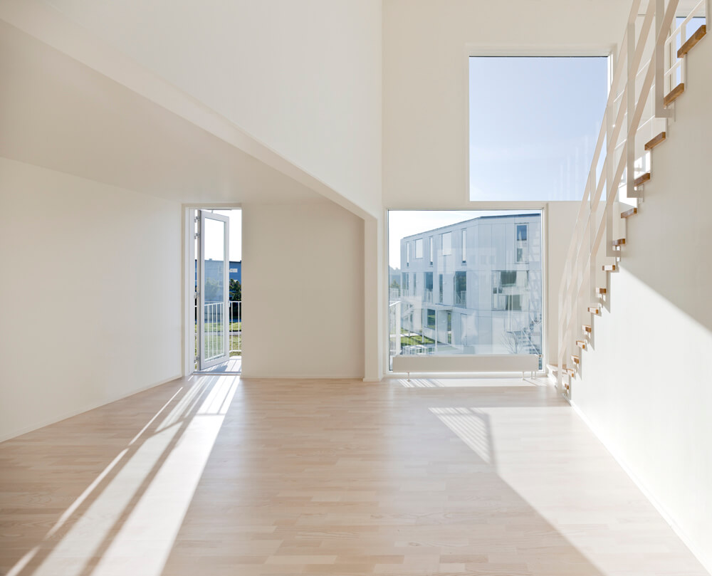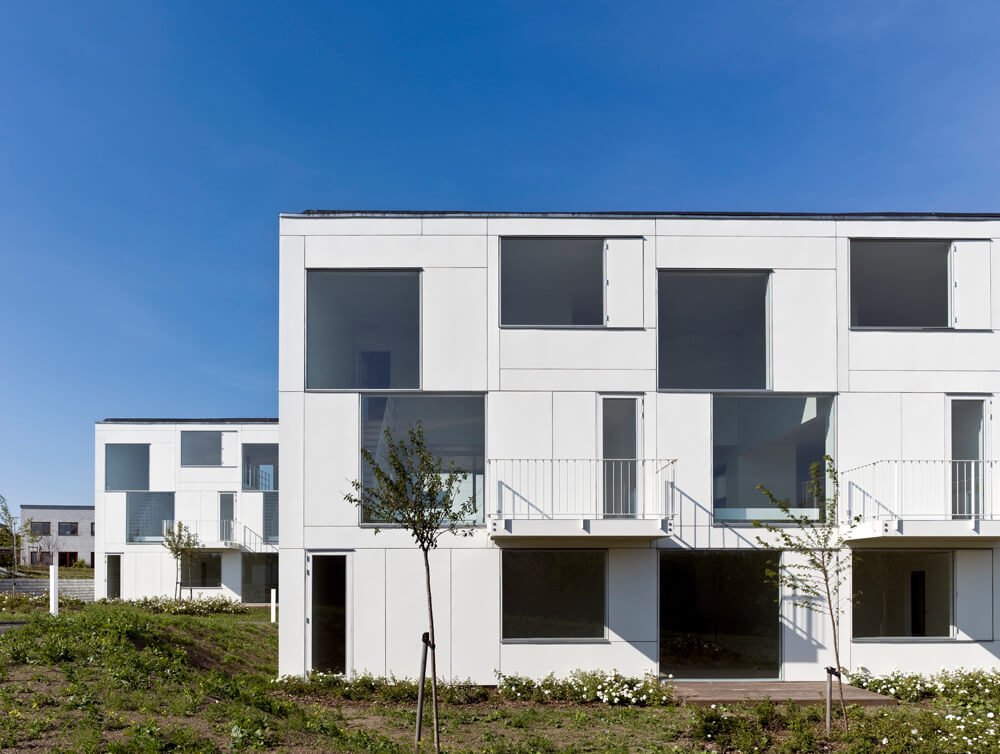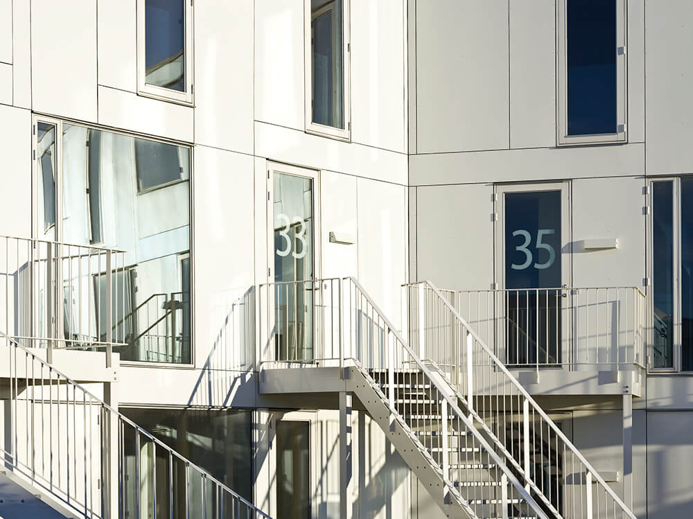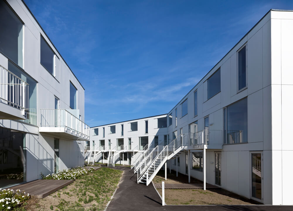 The complex is characterized by a lightness found in the crispness of the façade cladding, the intricately patterned individual staircases, the white-blossomed cherry trees, and white rose plantings that run throughout the landscape.
