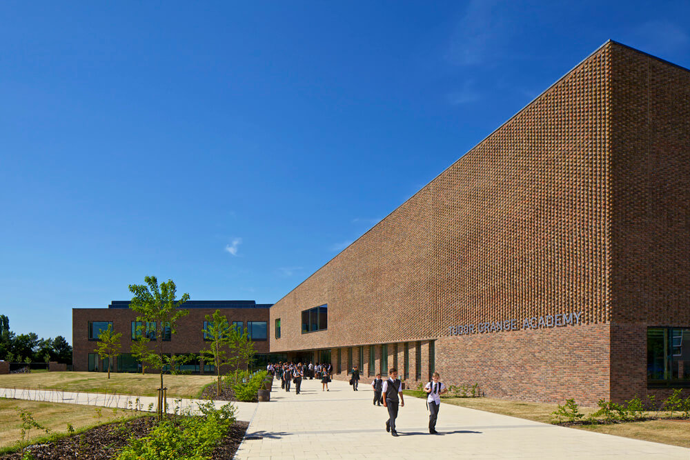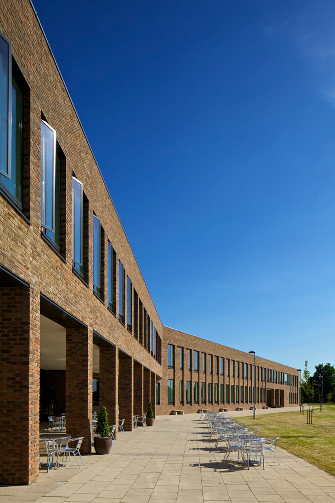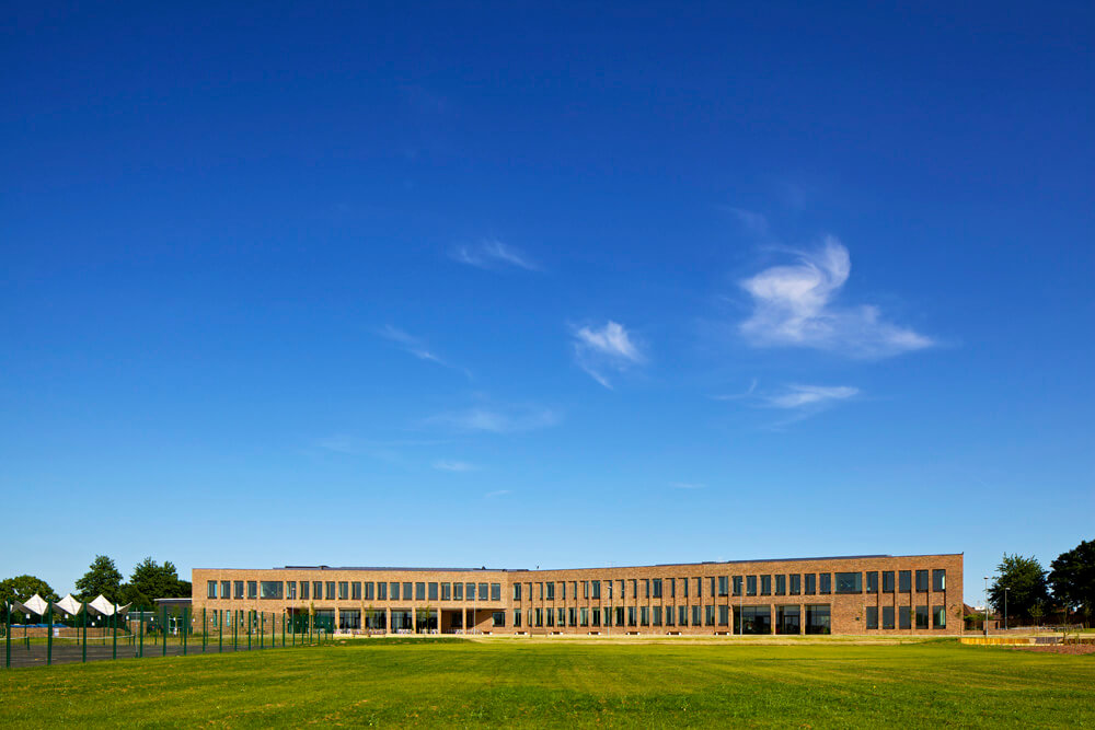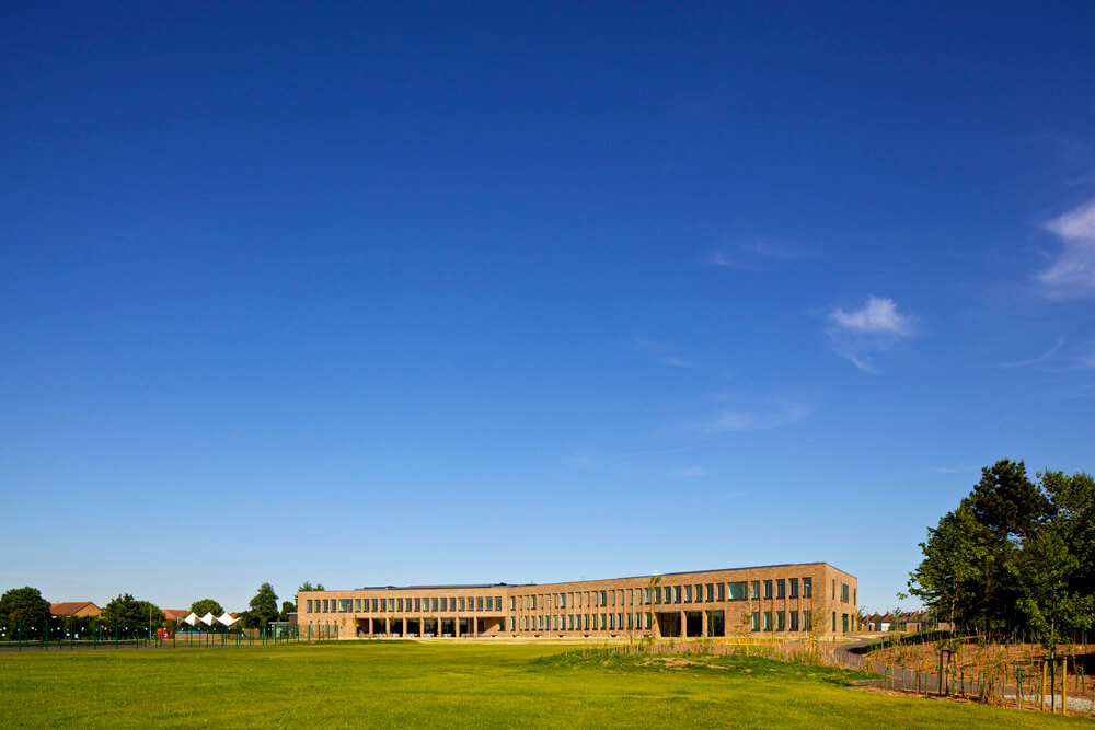 The school is clad in brick with the bold building volume area broken down with large openings that create a generous entrance, connection to exterior covered terraces and panoramic views to the landscape beyond.