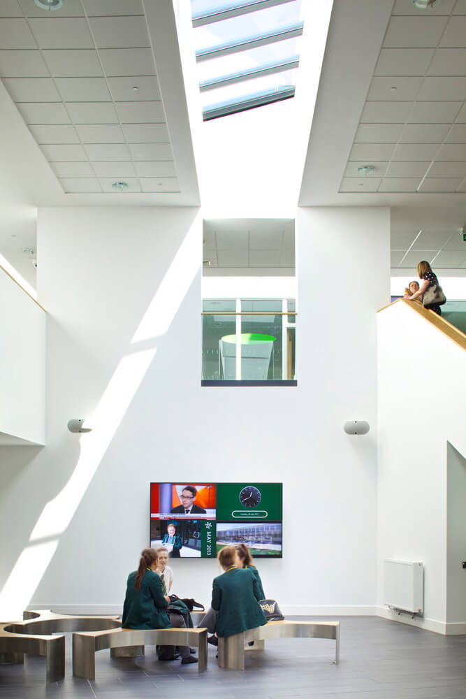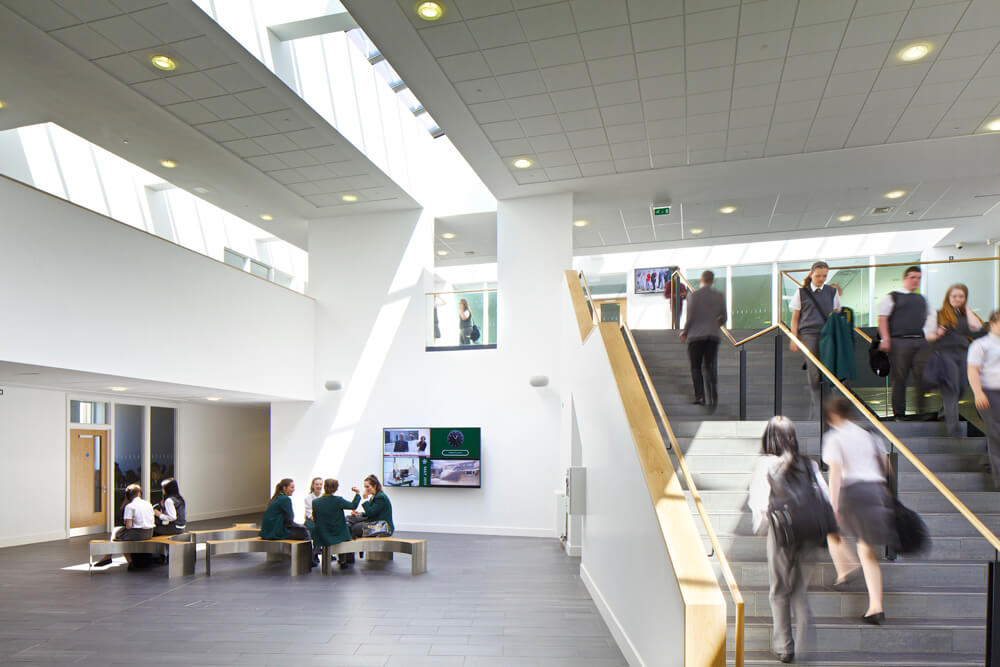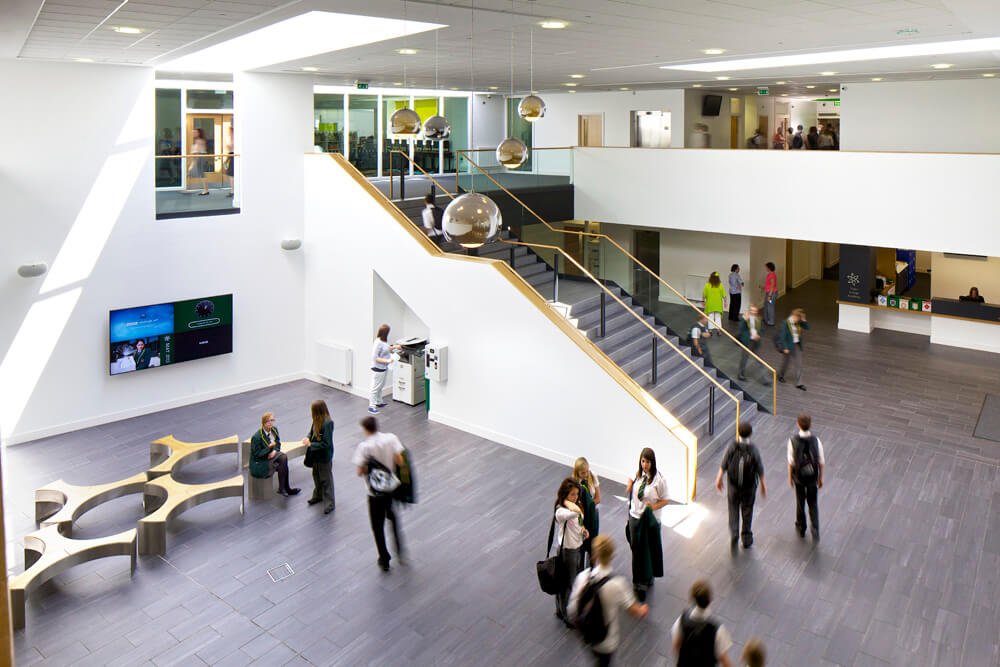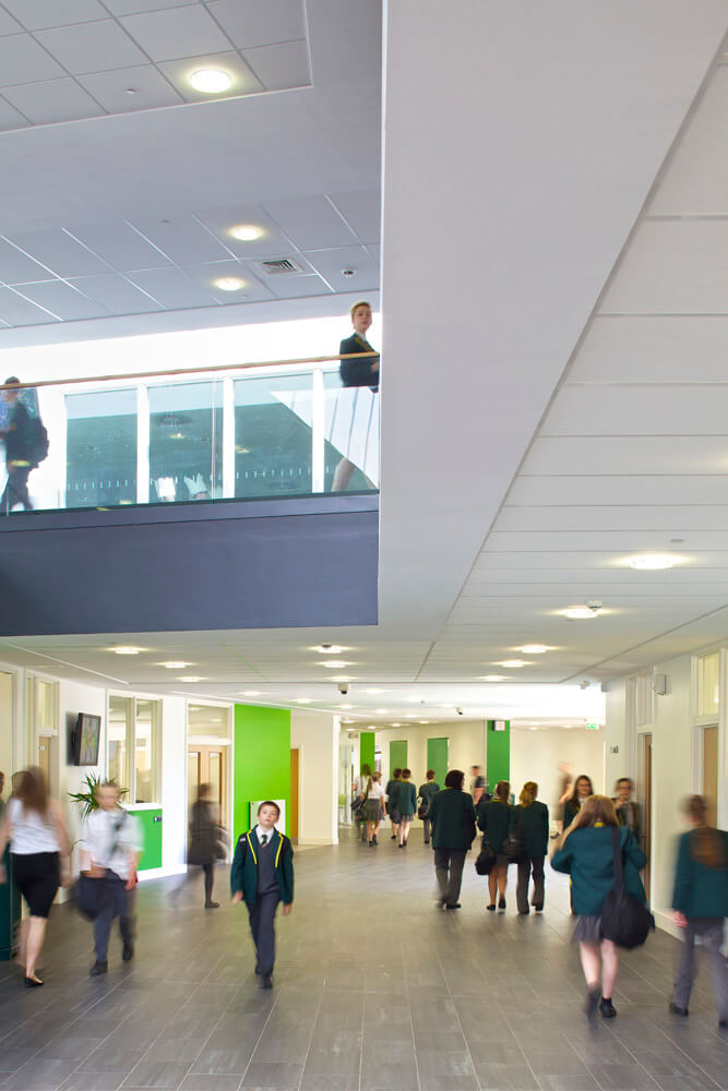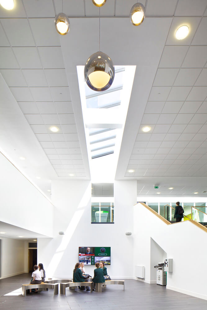 The academy is a dynamic form that knits into the existing buildings with a central double height heart space linking the teaching clusters. Each teaching cluster is arranged around a larger naturally light flexible lead lesson space that can accommodate a number of group sizes of up to 60 pupils.