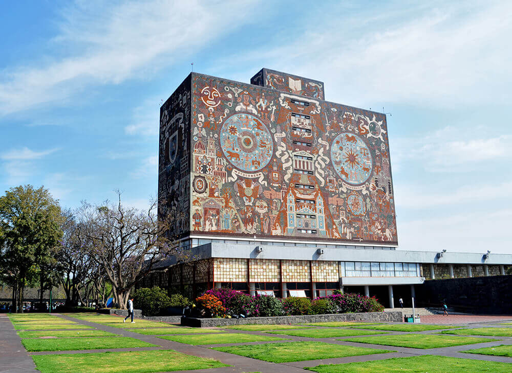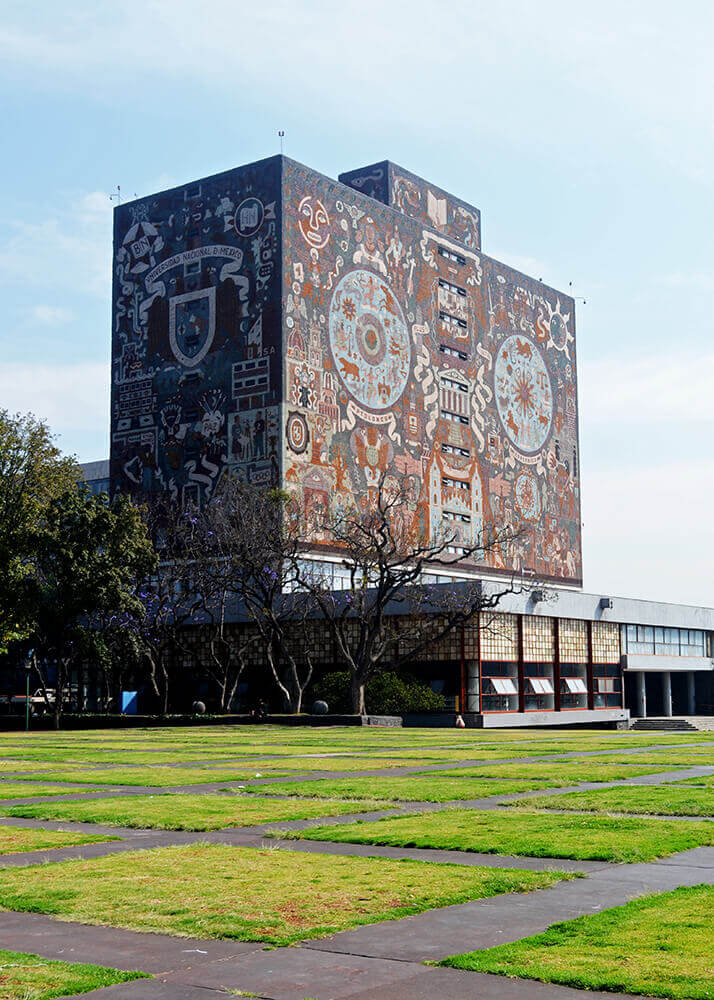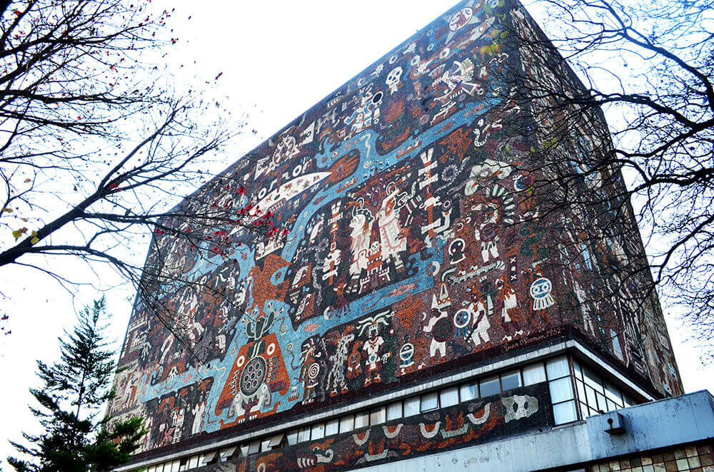 The Central Library Ciudad Universitaria’s most iconic building is this last mural which is recognized as the largest mural in the world, covering all sides of the Library, based on Aztec and Spanish motifs, as well as UNAM’s coat of arms.