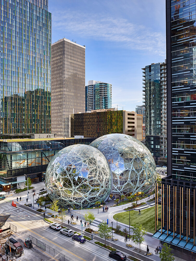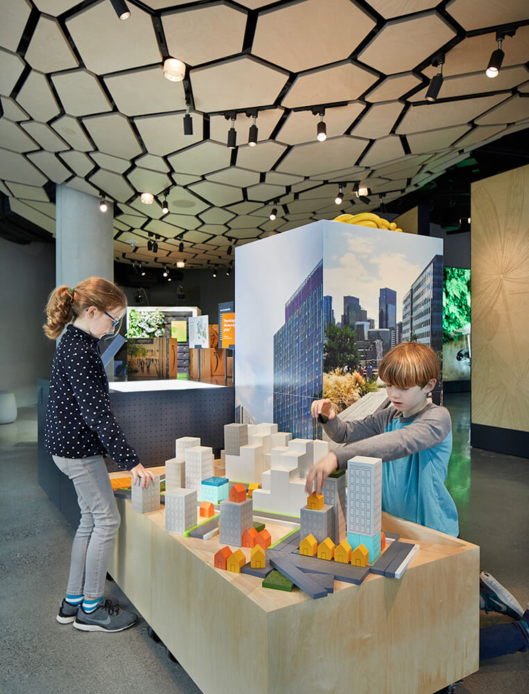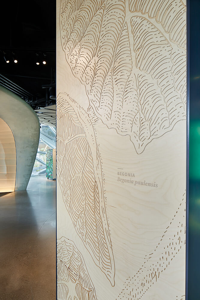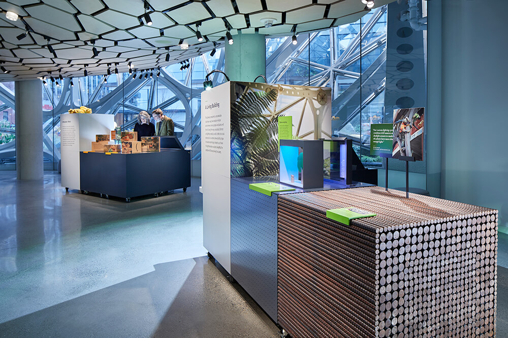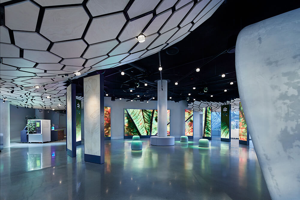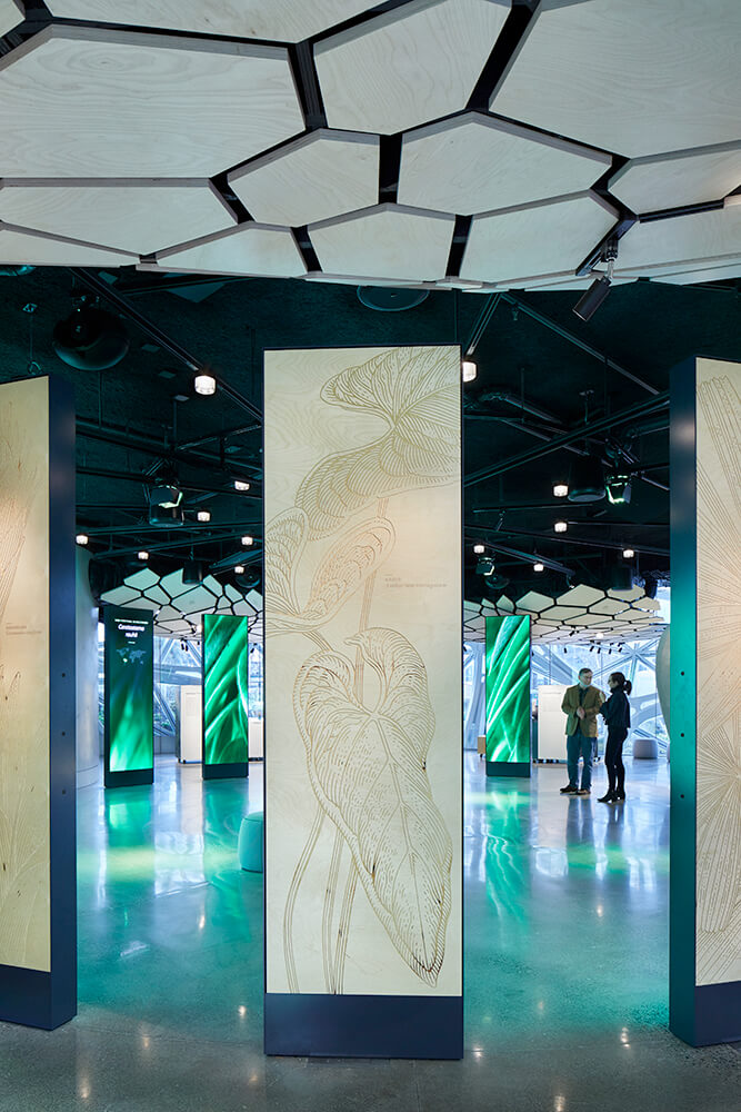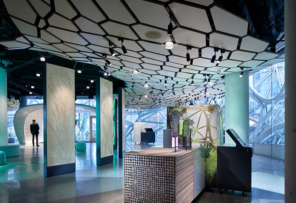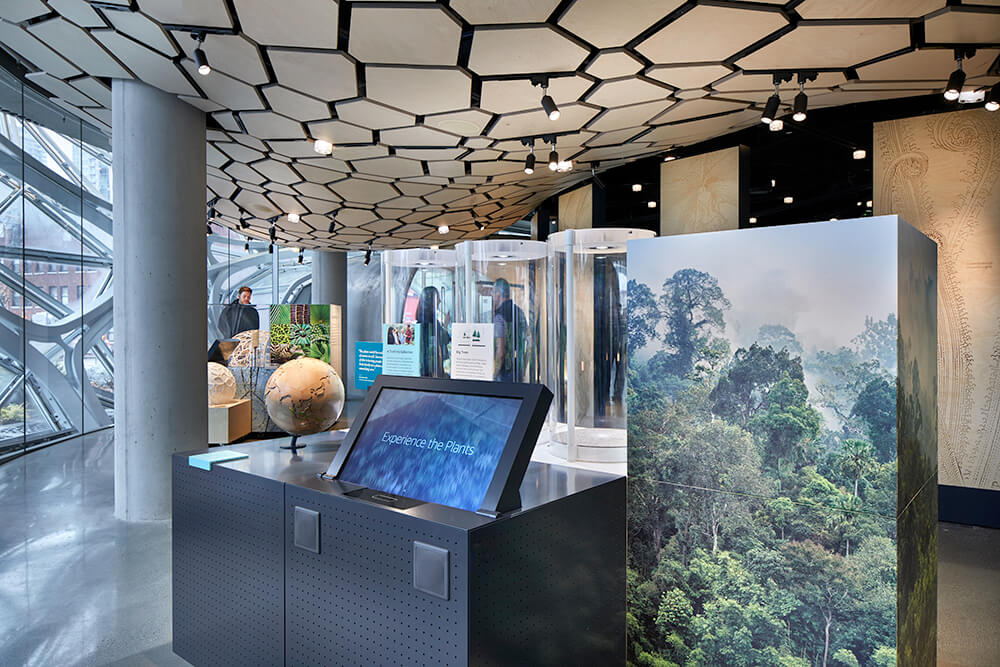 Understory at The Spheres is a multifunctional exhibit and visitor center designed to tell the story of The Spheres, Amazon’s iconic and wholly unique insertion into the heart of Seattle. The exhibit unravels the complexity of the architecture and engineering and the very idea behind bringing people closer to nature on a daily basis in the heart of the city. The 3,883-square-foot exhibit is situated at the base of one of The Spheres, providing a fly-through of the orbicular buildings above and something the visitor won’t get in The Spheres themselves, extreme close-up and intimate footage of the plants in an interpretive and immersive experience.