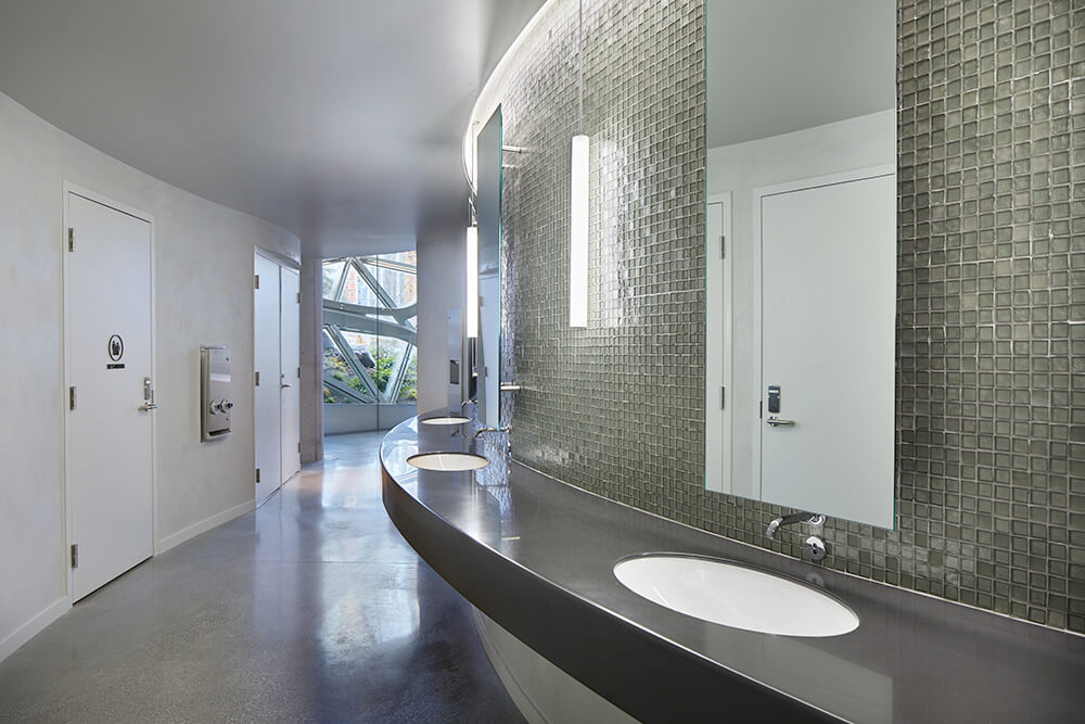 The experience begins at the entry, which features a curved, organically formed vestibule, crafted in venetian plaster. Entering the space itself, a series of tall, high-definition screens encircle you, providing a shifting video panorama of plants and trees, accompanied by a soundtrack that evokes sounds of nature. At distinct locations, visitors standing in front of the large video wall can hear stories about the plants in The Spheres that sound like whispers through the forest, which nobody else can hear. Arrayed around the perimeter of the space is a series of five displays, each providing a deep-dive into different aspects of The Spheres’ story, such as biophilia, the idea behind The Spheres, and the design and engineering of the buildings. Modular cubes are assembled into a variety of forms to display architectural models, three-dimensional interactives, and a changing array of small-scale plants. Touch screen installations hold video content for visitors to immerse themselves into interviews and stories about the plant life and the architecture. The modular units dig deep into technical details. Over three miles of under-slab wiring was installed to support the multi-use space and exhibits. Restrooms are located behind the primary curved projection wall. To minimize the footprint, unisex toilet cabinets line one wall, while sinks line the other, relying upon a single circulation space.