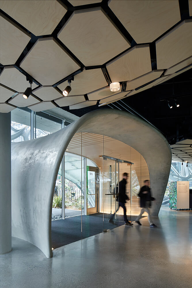Among the design challenges was the need to evoke the drama and wonder of The Spheres in a location that feels nothing like the lofty spaces of The Spheres themselves. The physical space was formidable: an enormous duct occupies a huge part of the ceiling, which was already quite low; there is a column in the center of the space (it supports one of the largest trees above); and natural light is very limited. To conceal the ductwork and equipment-which would otherwise be an imposing presence overhead-an array of custom-designed hexagonal Baltic Birch plywood panels organically reshape the ceiling. The venue also needed to be imminently flexible; the solution was to put virtually everything on wheels, making it possible to completely transform the space when needed for presentations or parties.