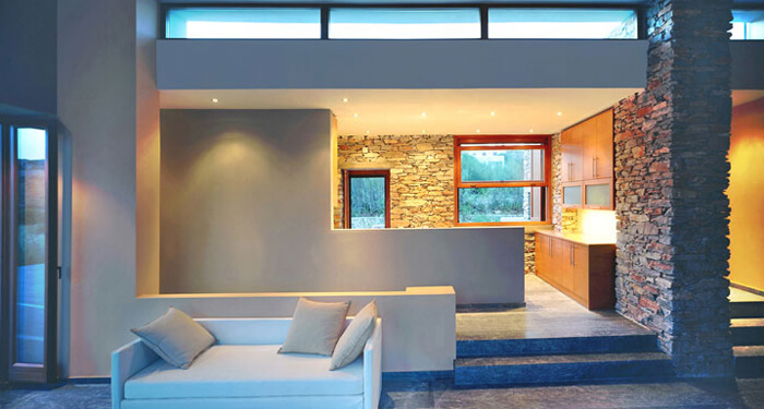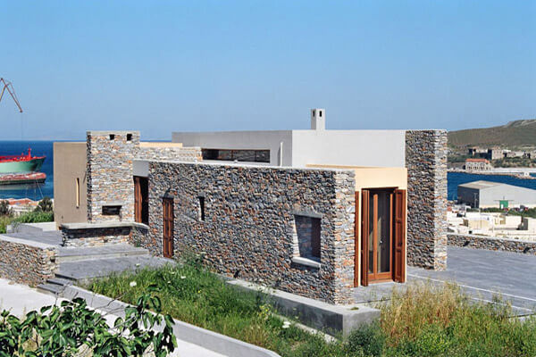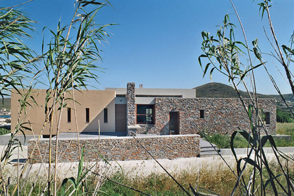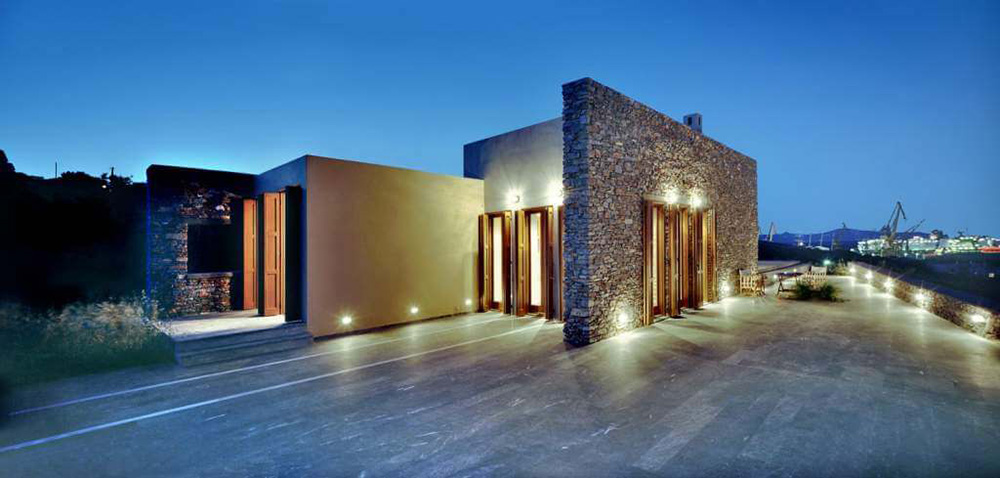 The irregular outline of the site as well as the view, dictated the almost linear development of the ground plan, in the centre of which the living spaces are developed, while flanking the latter are the sleeping areas. The rhythmical repetition of the openings that were created instead of large openings which are prohibited by the building regulations, as well as the uniform use of the same material both inside and outside, reinforce the visual connection with the surroundings. The neoclassical mansions of the island’s main city are finding references from The tall, narrow openings with the wooden shutters and the proportions of the building.