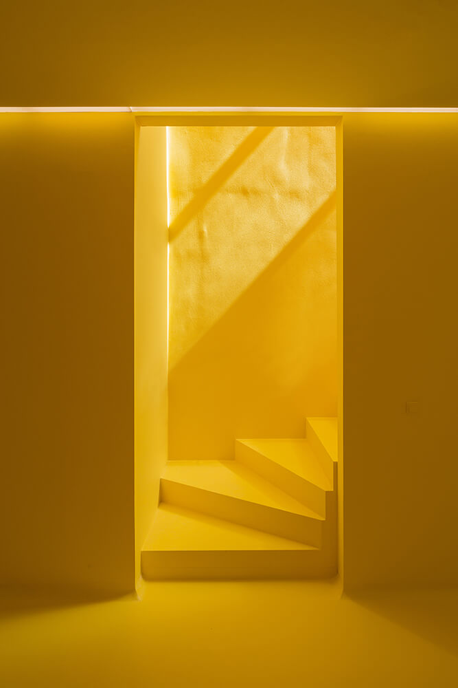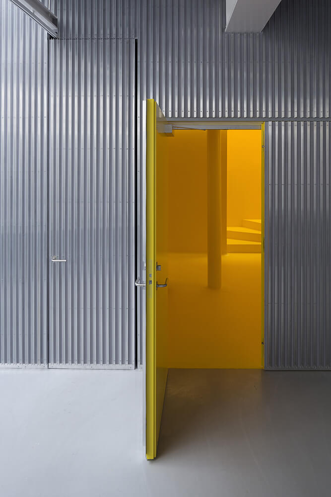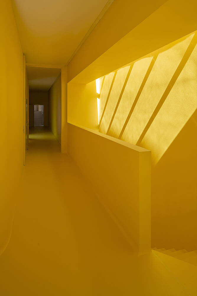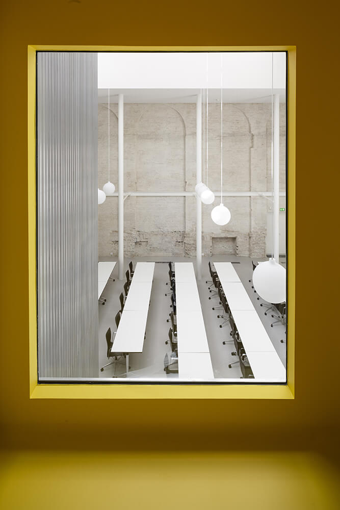 Valencia’s triple high hall is a unique space in the dense neighborhood of Vesterbro. The large beautiful room with the continuous skylight is positioned as a detached building behind the front building. The hall is connected to the lobby through the fairy tale garden that stages the spatial shift. The hall is the project’s central space and provides a framework for Danish Lawyers’ course and conference activities. A large-scale furniture is located in the hall, which contains both the vertical relationship between basement, ground floor and first floor and a floating meeting box located in a visual open connection with the chamber. The existing walls of the hall have been maintained and renovated as gently as possible. The new furniture is covered with special aluminum profiles in front of an acoustic damping textile. The floors and ceiling of the hall is designed as neutral as possible in concrete and acoustic plaster. Inside the new furniture all surfaces are painted yellow to highlight the new spaciousness and create a readable spatial hierarchy.