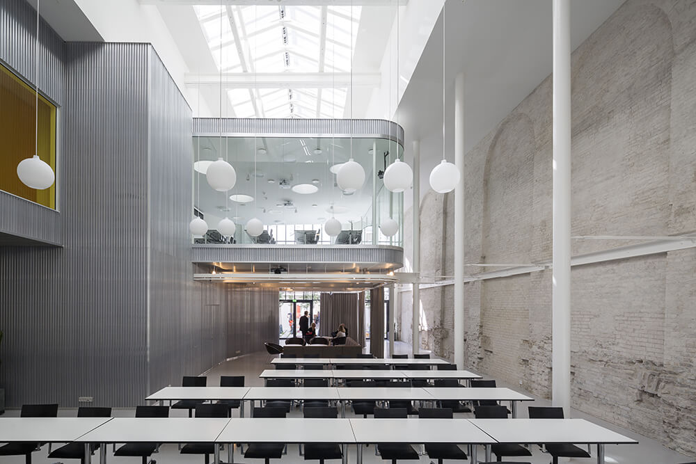 The intention of the project was to expose the building so that the unique spatial qualities were clarified, the visual connections and the spatial flow enhanced, and the individual rooms cleaned for unsettled architectural additions. The existing buildings consists of three different building typologies; The block-housing (front building), the assembly-hall, and the rear building, which used synergistically offers a large range of applications.