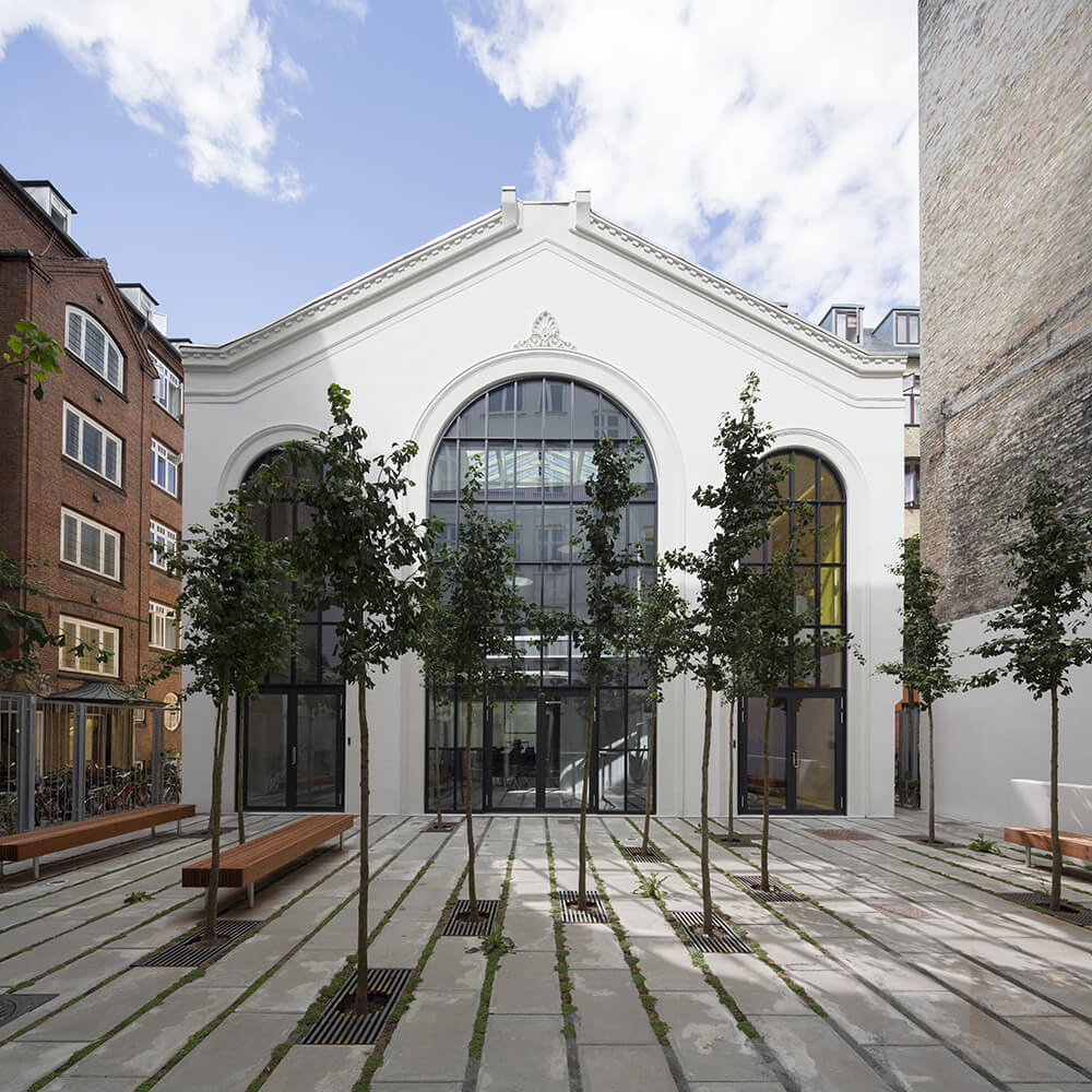The front building, with its façade to the busy Vesterbrogade, is a classical Copenhagen property in 5 floors: The high-ceilinged entrance is radically changed from its current closed form to a modern minimalist and transparent ground floor with continuous glass facades on both house facades so that the characteristic old hall, placed in a new fairytale garden, is exposed to Vesterbrogade. The ground floor forms naturally as a lobby for the Association of Danish Law Firms. The first three floors of the building houses the administration for the Association of Danish Law Firms, and the top 3 floors residential apartments.