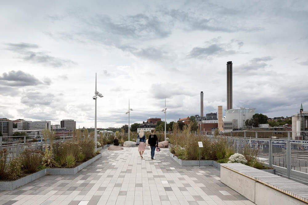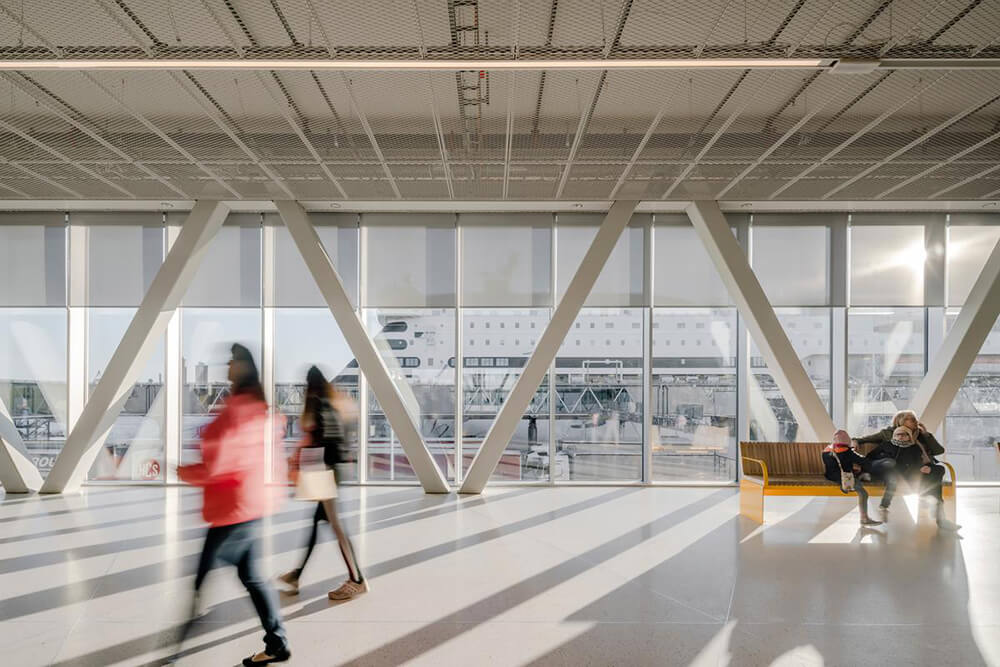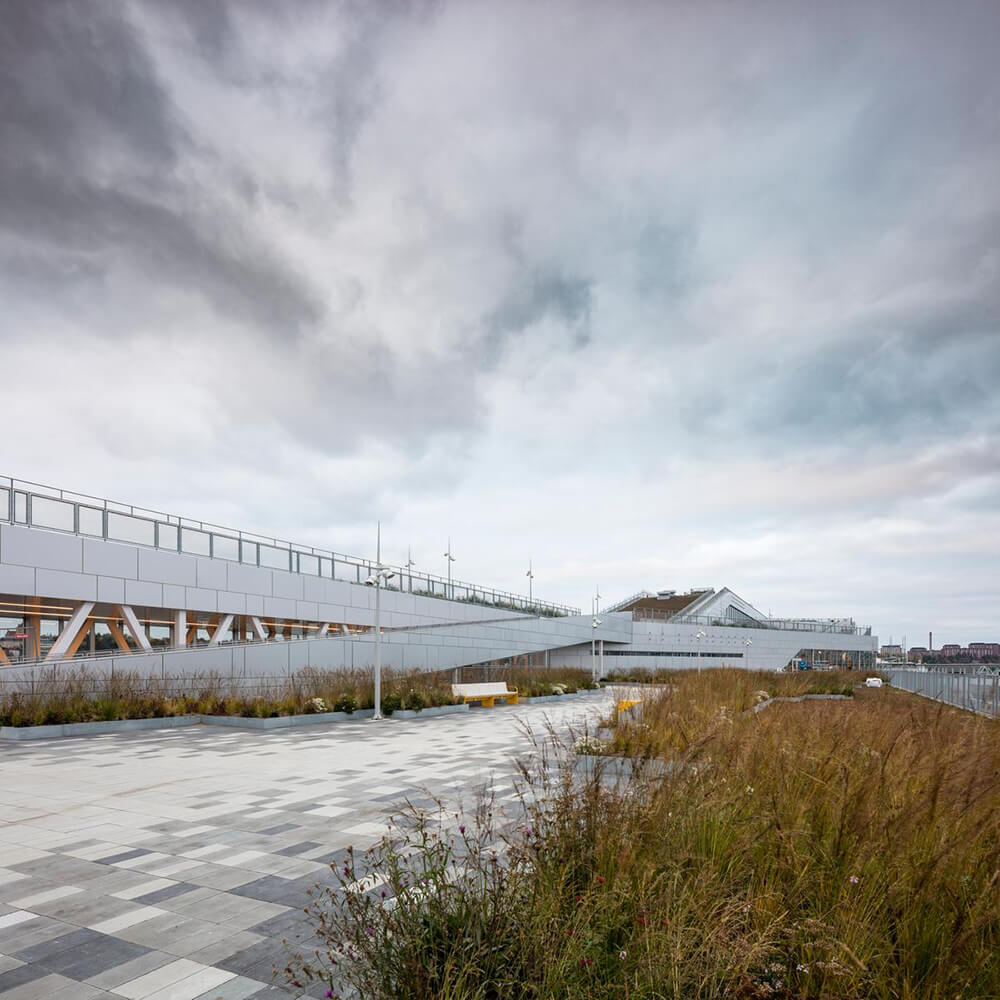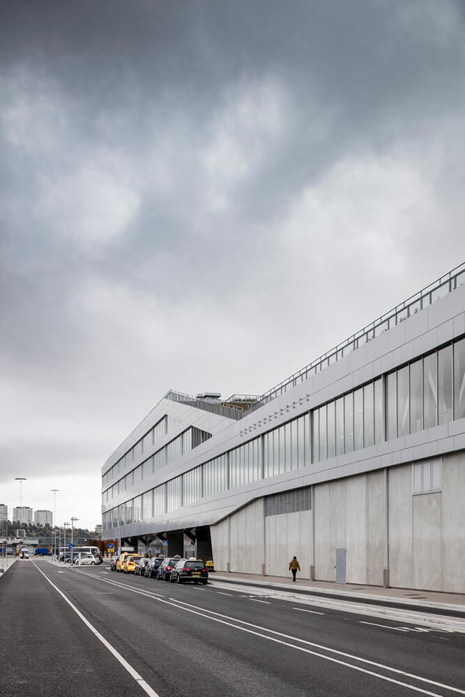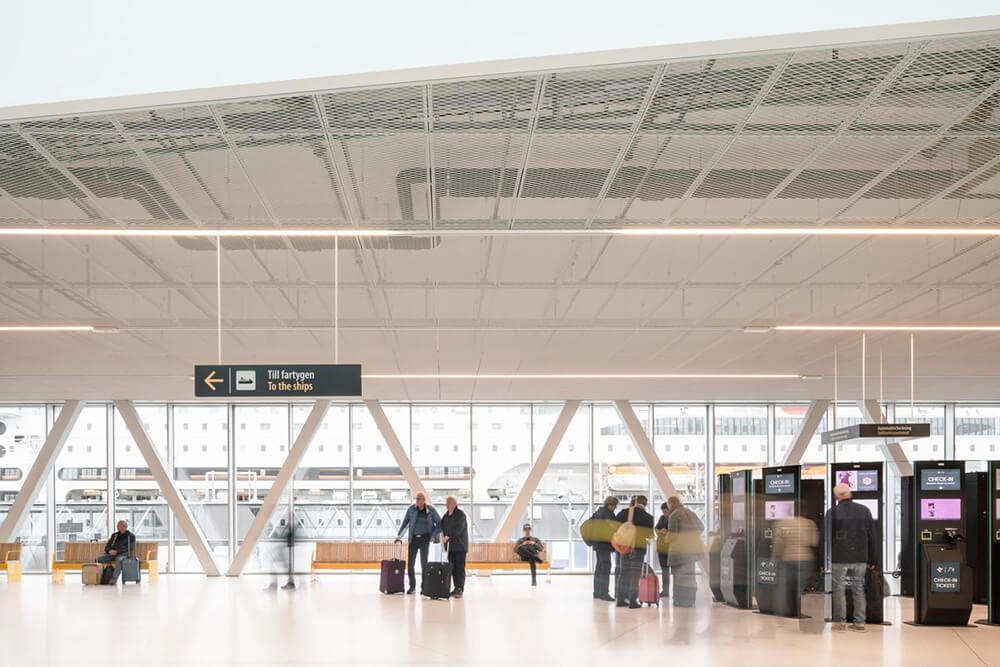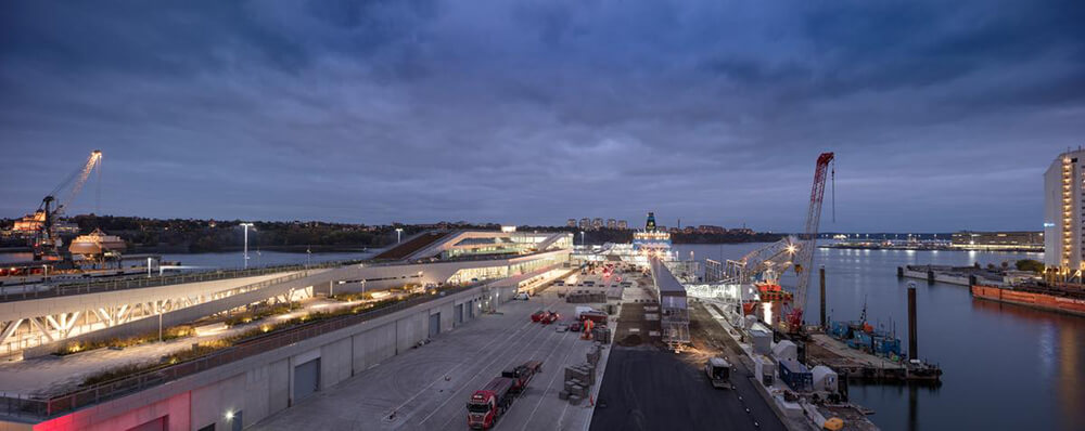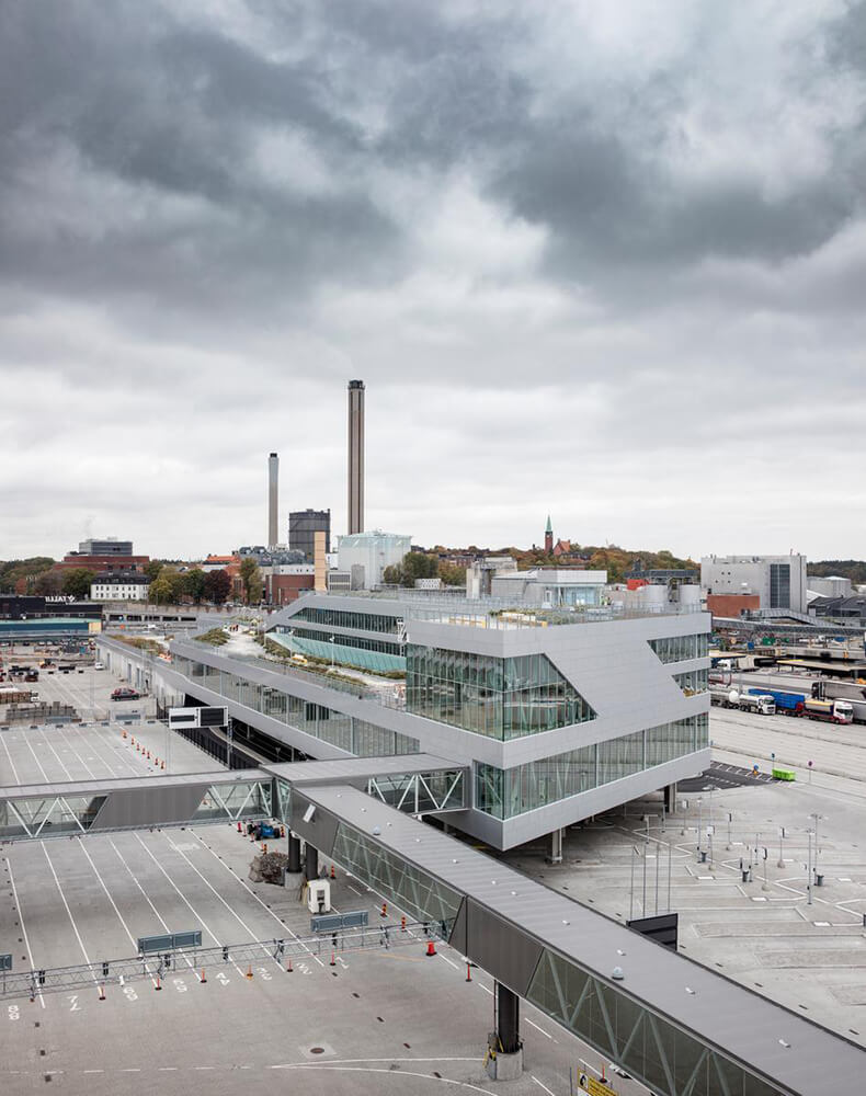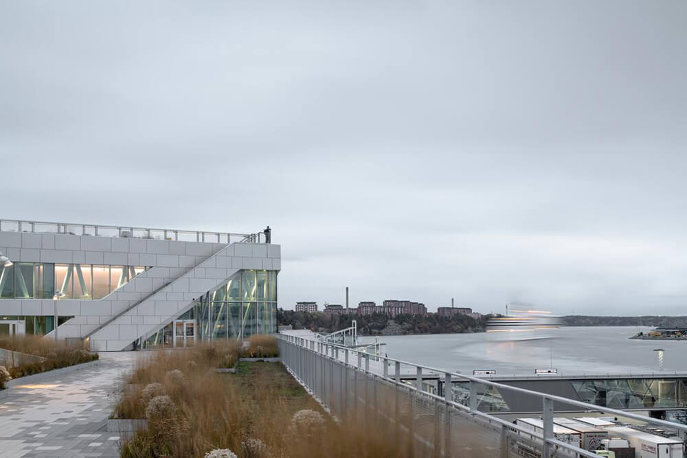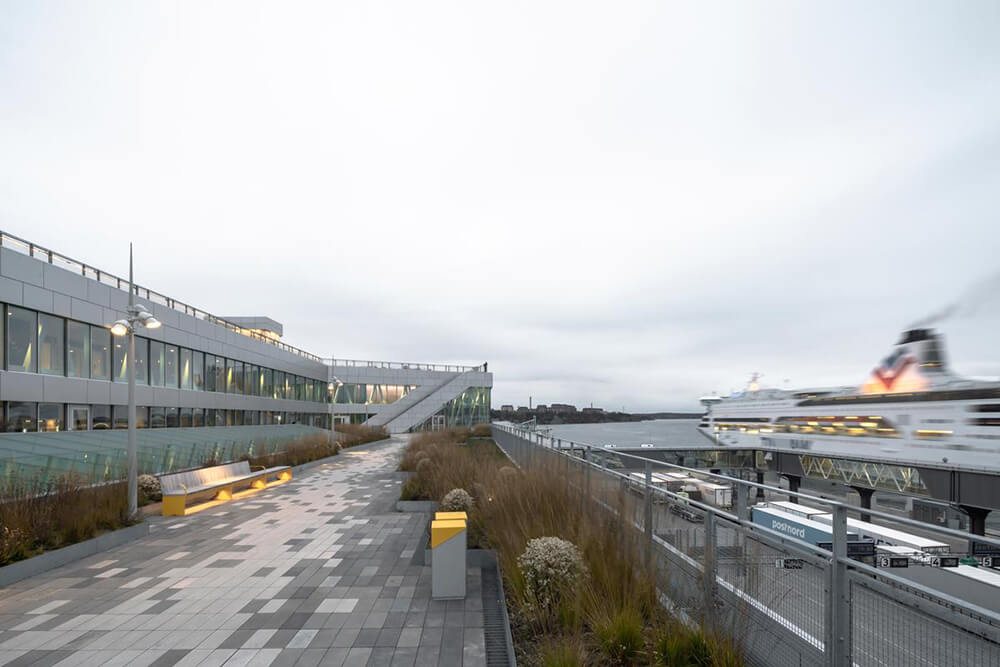 The terminals tectonic architecture is a homage to the shape of a moving vessel and the industrial environment – with large cranes and warehouses – that previously characterized the ports. At the same time, the terminal has an ambitious sustainable profile, characteristic of the entire development of the area. The main idea has been to create natural links between central Stockholm and the new urban area in connection with the terminal, so that city life will naturally flow into the terminal. Therefore the passenger part of the terminal is raised to be at level with the urban zone, so it is easy for both pedestrians and traffic to access. At the same time the roof of the terminal building is designed as a public park. Where a varied topography of greenery with stairs, ramps, niches, and cozy corners, invite both Stockholmers and passengers for a stroll or relaxing moments, while enjoying the view of the ferries, the archipelago, and the city skyline.