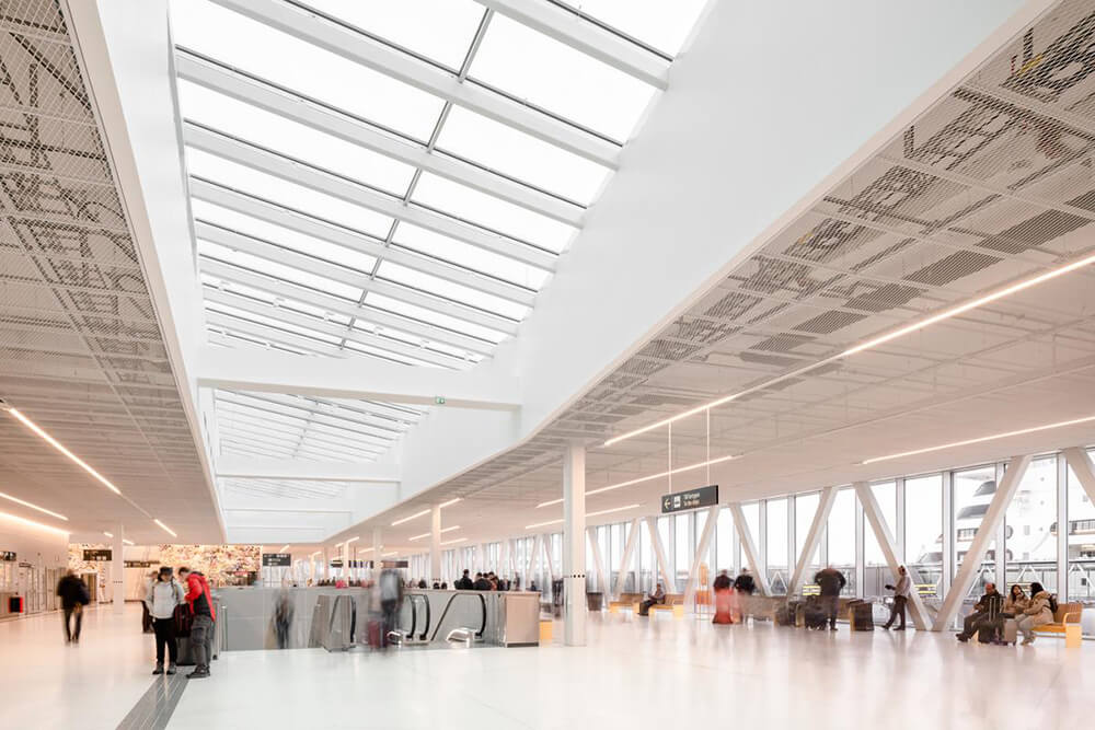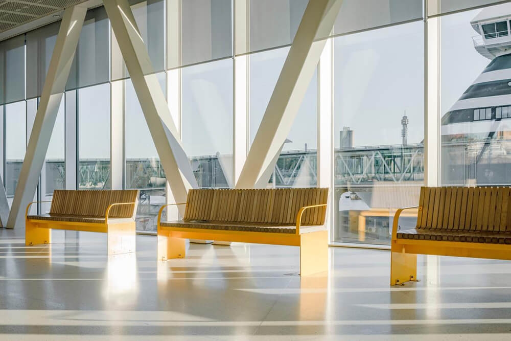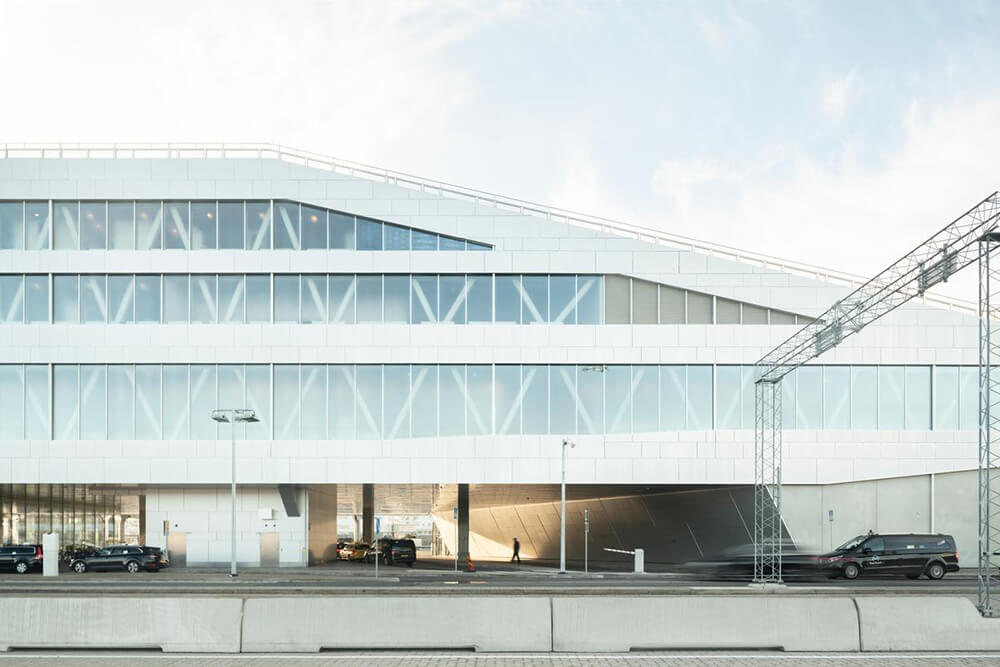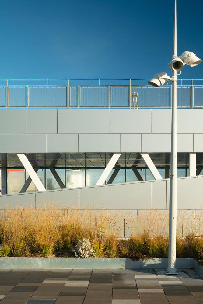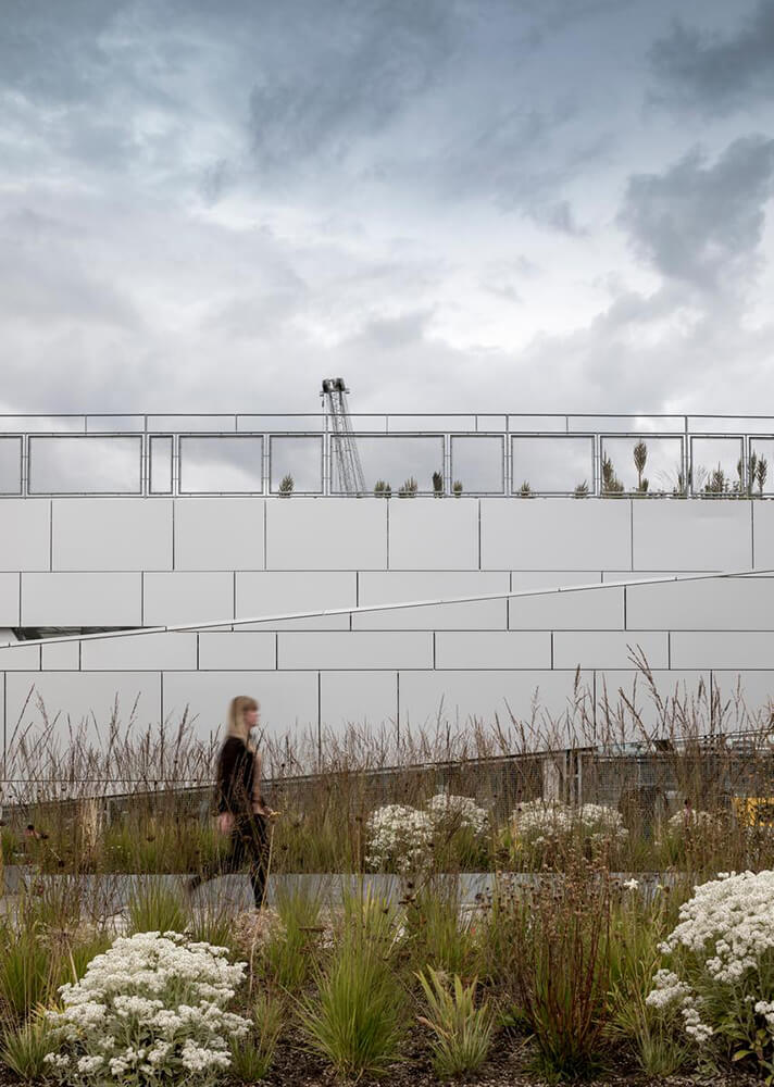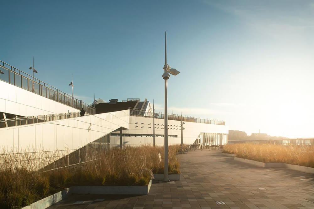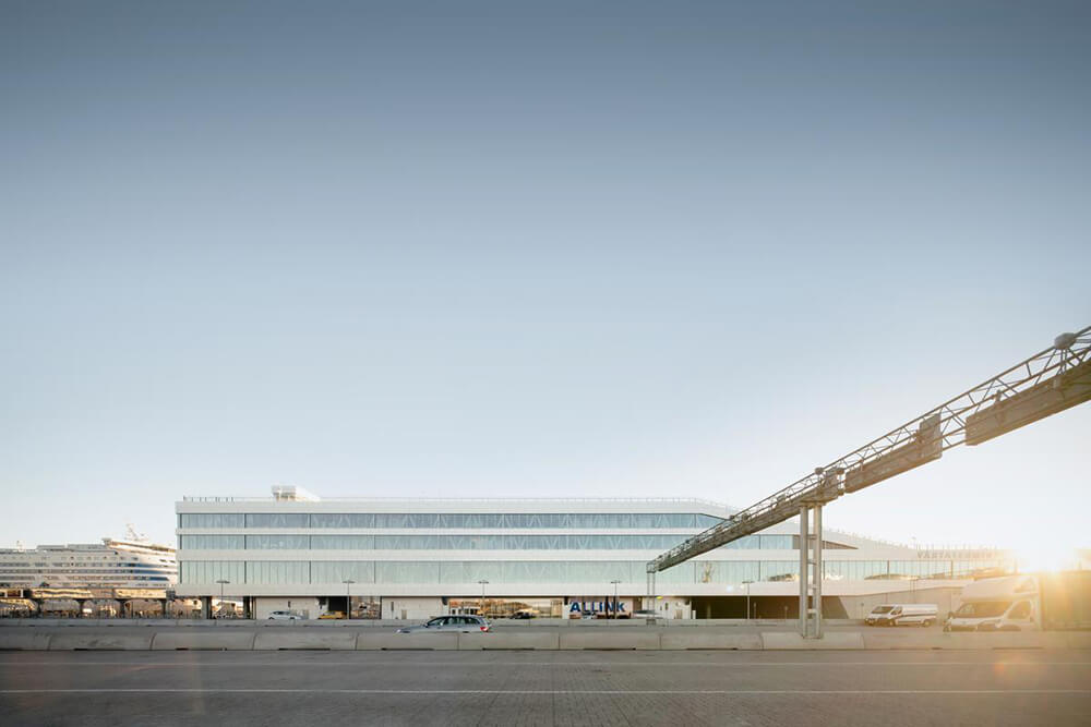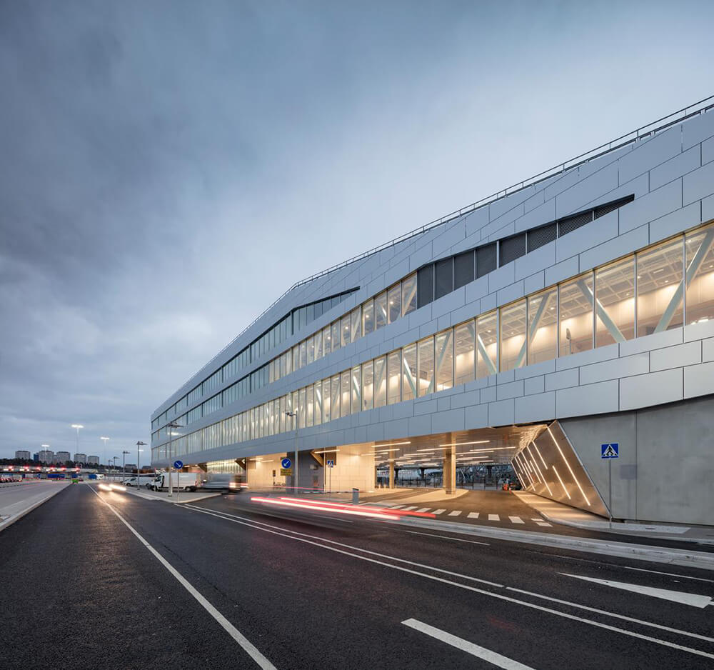 The terminals tectonic architecture is a homage to the shape of a moving vessel and the industrial environment – with large cranes and warehouses – that previously characterized the ports. At the same time, the terminal has an ambitious sustainable profile, characteristic of the entire development of the area. The main idea has been to create natural links between central Stockholm and the new urban area in connection with the terminal, so that city life will naturally flow into the terminal. Therefore the passenger part of the terminal is raised to be at level with the urban zone, so it is easy for both pedestrians and traffic to access. At the same time the roof of the terminal building is designed as a public park. Where a varied topography of greenery with stairs, ramps, niches, and cozy corners, invite both Stockholmers and passengers for a stroll or relaxing moments, while enjoying the view of the ferries, the archipelago, and the city skyline.