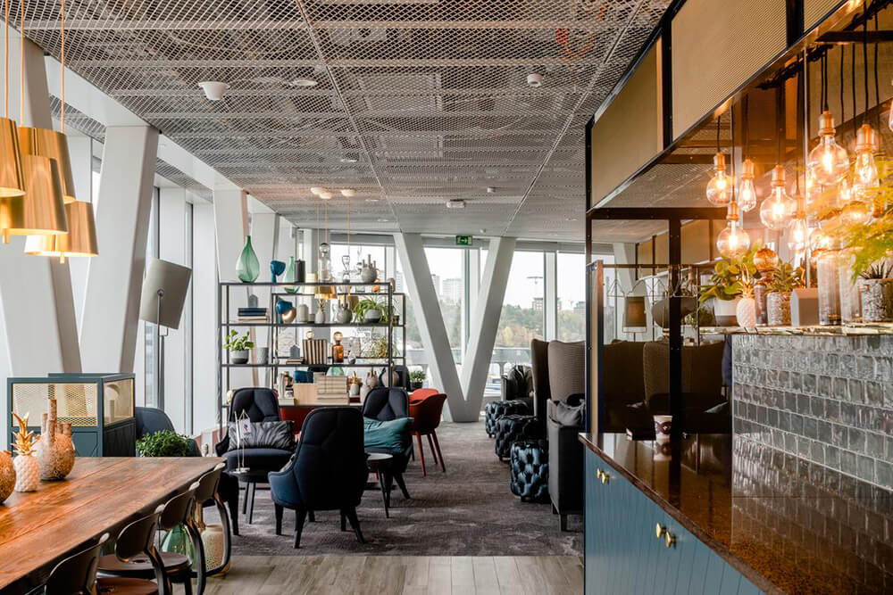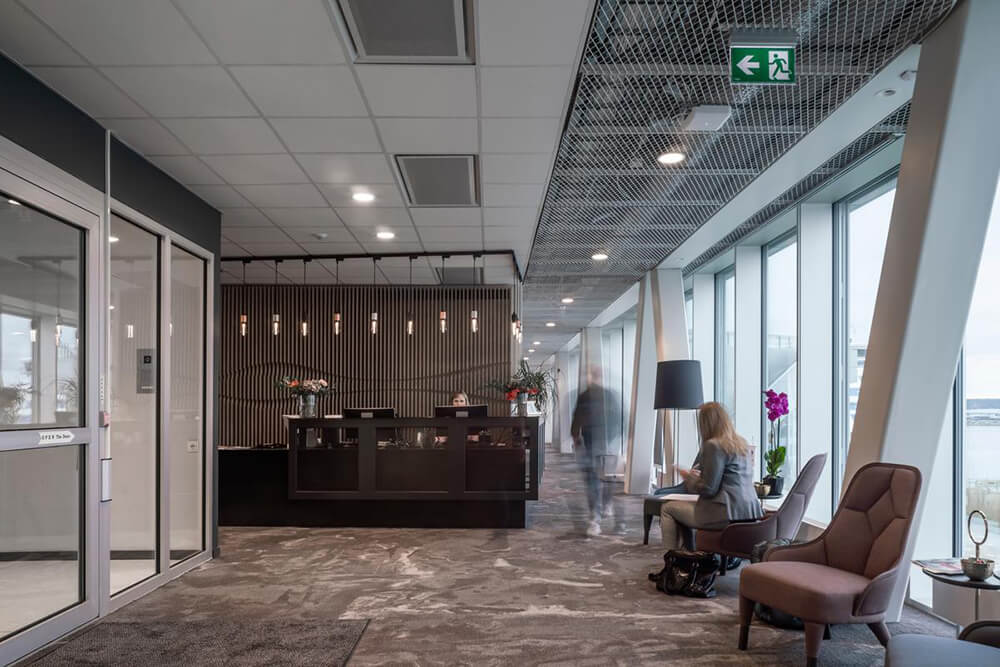 A sculptural cut in the roof creates daylight all the way down through the building enhancing the vertical flows from the harbor floor up to the top floor. Glass from floor to ceiling on each floor creates a horizontal transparency with a unique 360-degree panorama of the harbor and blurs the border between inside and outside.
