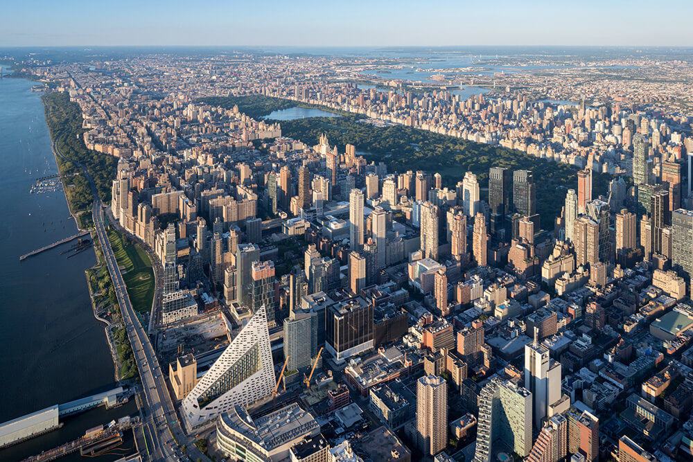 The form of the building shifts depending on the viewer’s vantage point. While appearing like a pyramid from the West Side Highway, it turns into a dramatic glass spire from West 58th Street.