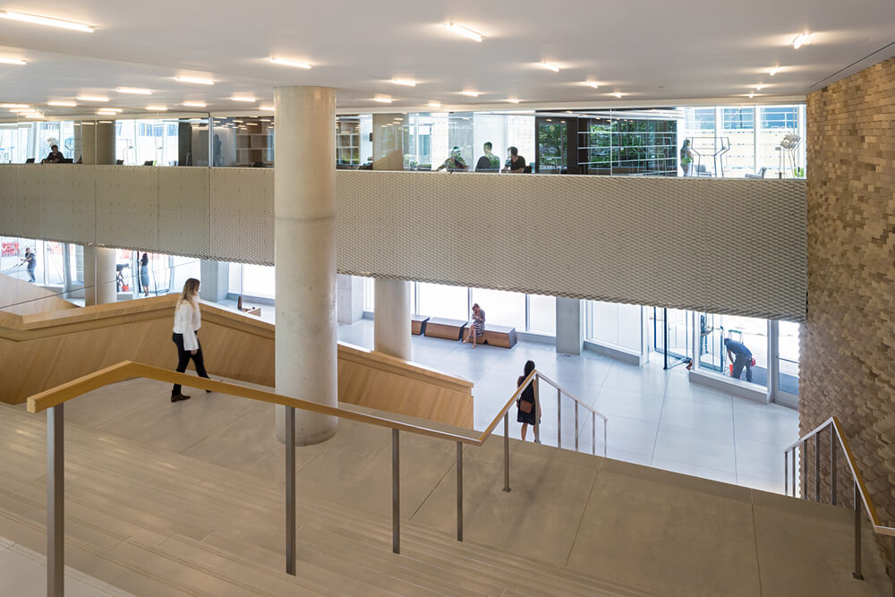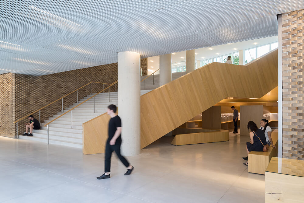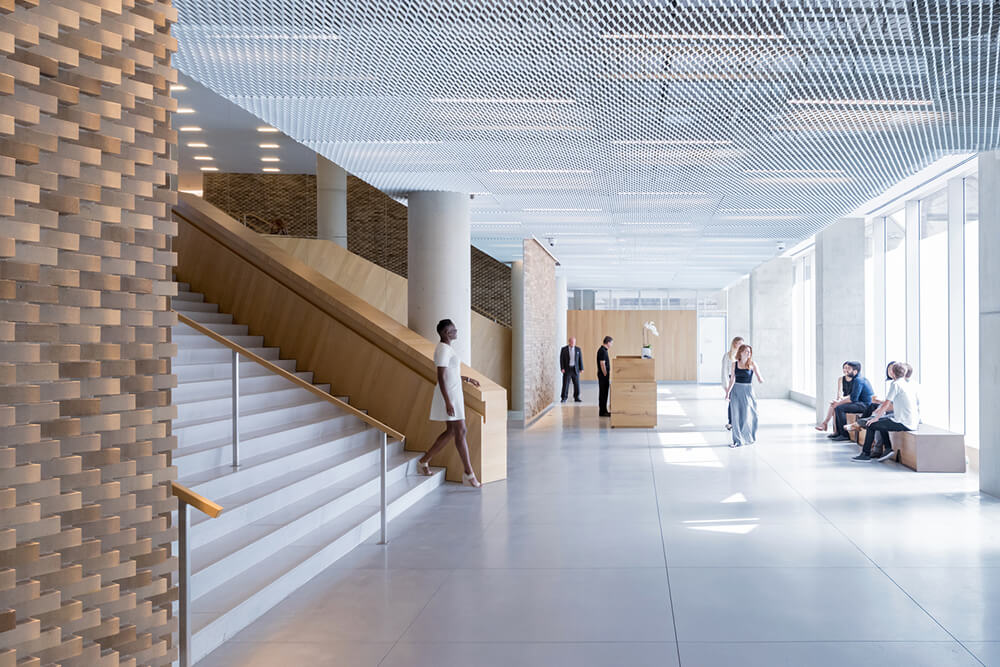 The slope of the building allows for a transition in scale between the low-rise structures to the south and the high-rise residential towers to the north and west of the site. The highly visible sloping roof consists of a simple ruled surface perforated by terraces – each one unique and south-facing. The fishbone pattern of the walls is also reflected in its elevations.