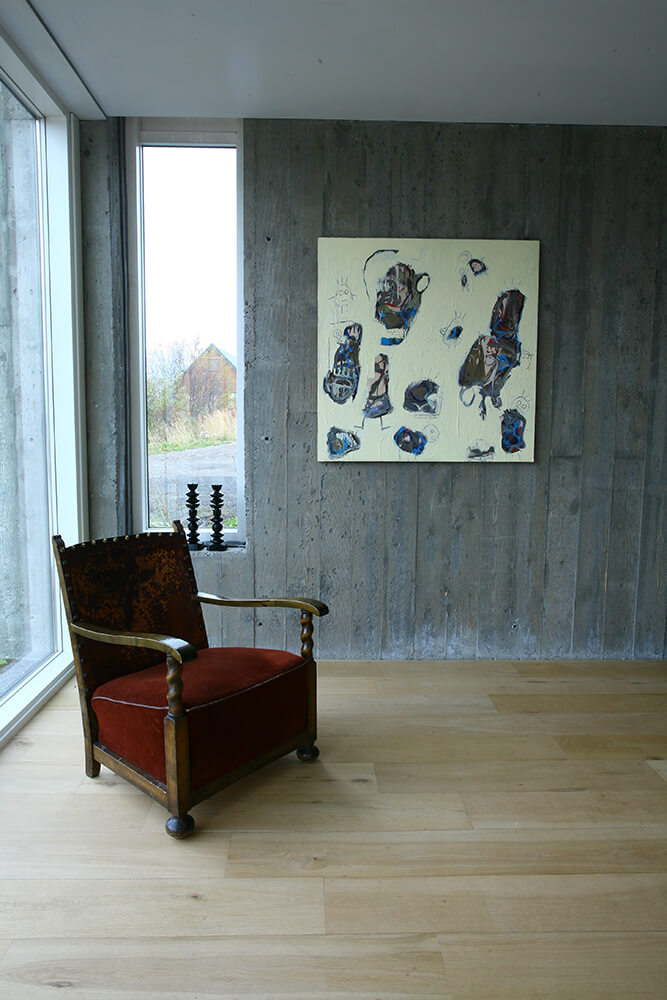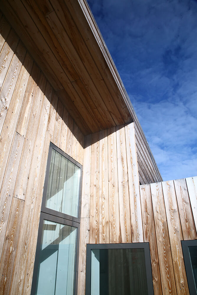 Villa Lóla is built with a frame of sustainable goal settings. It is clad on the exterior with Larch-wood. The larch is weathered to its nature gray-ish color, forming a natural weather protection. All loadbearing members are of wood except for one concrete wall, used for stabilizing the structure, and a concrete foundation. Flooring is of robust wooden boards and concrete terrazzo. Inner walls are gypsum surfaced stud frame walls painted with environmentally friendly paint. All windows are of wood, clad with aluminum on the exterior.