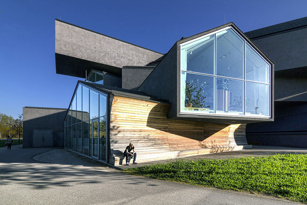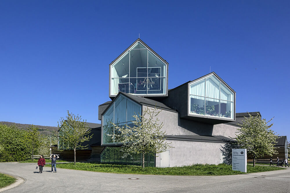 The structure is unified by the charcoal of the exterior stucco skin, ‘earths’ it and connects it to the surrounding landscape. An entryway to the Campus is one of the building’s functions, like a small, vertically layered city. An open central area is defined by a wooden plank floor, around which five buildings are grouped. These buildings are a conference area, an exhibition space for the chair collection of the Vitra Design Museum and a conglomerate comprising the Vitra Design Museum Shop. There are also the lobby with a reception area and cloakroom, and a café with an outdoor terrace for summer use. Visitors are taken to the fourth storey with a lift, where the circular tour begins. A spectacular view of the Tüllinger Hill is offered by the glazed northern end of the room, upon exiting the lift. A panorama of Basel with the industrial facilities of the pharmaceutical sector is opened at the opposite end, where the glass front is recessed to create an exterior terrace. The views of the surrounding landscape determine the directional orientation of the houses that is hardly arbitrary, as one discovers on the path through the VitraHaus.