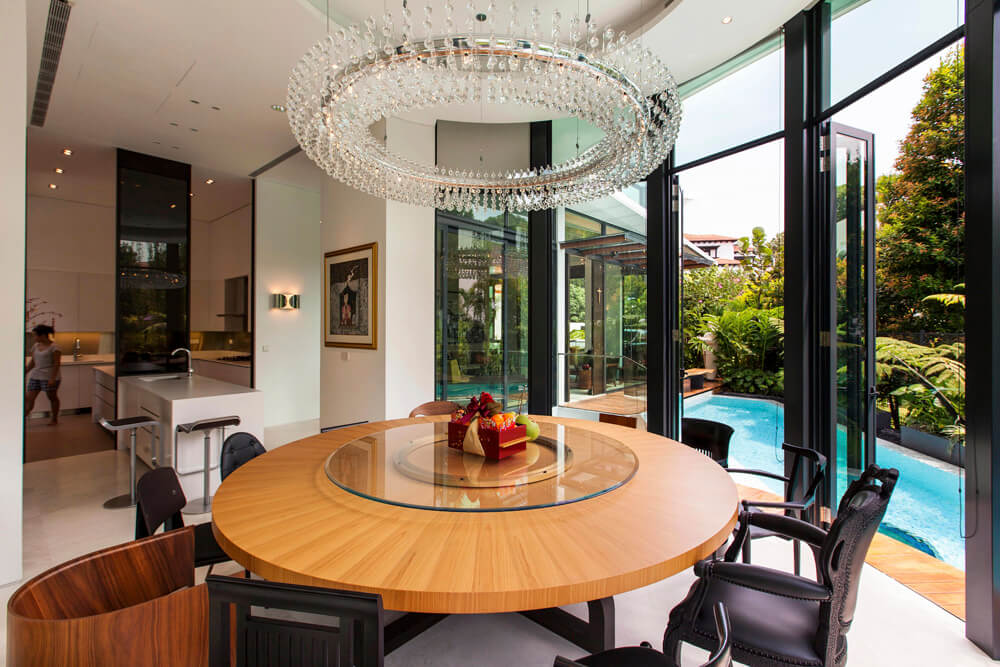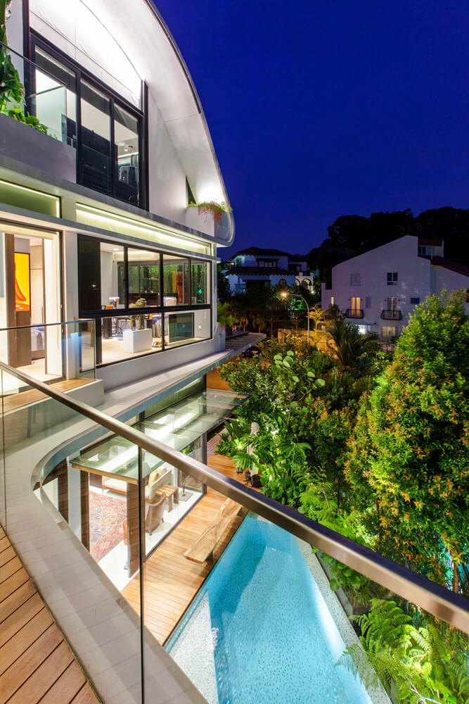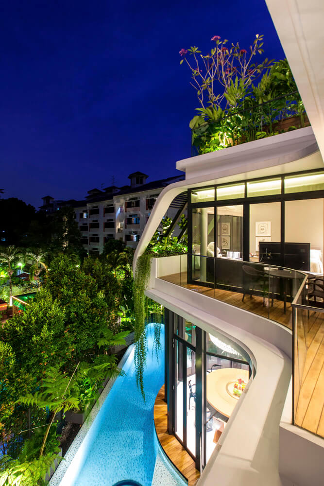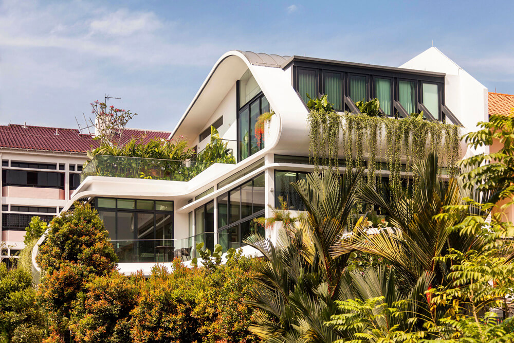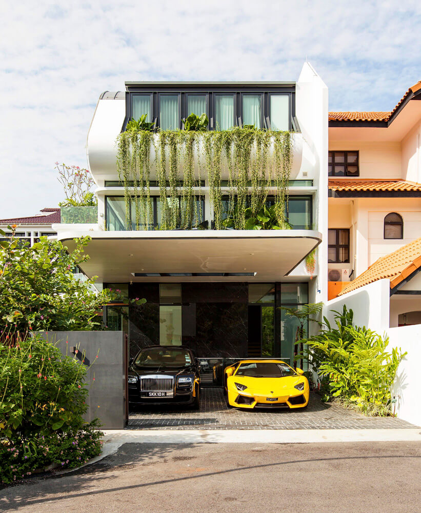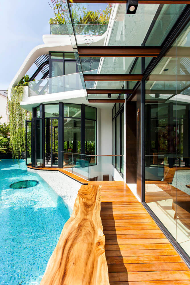 A house in Singapore with a modern interior design by Aamer Architects. The house has a terrace and sits at a corner on a trapezium shaped land with lines. These lines wrap and fold towards distance views while providing privacy from close neighbours. They also achieve a distinctive form that is futuristic and indeed tropical.