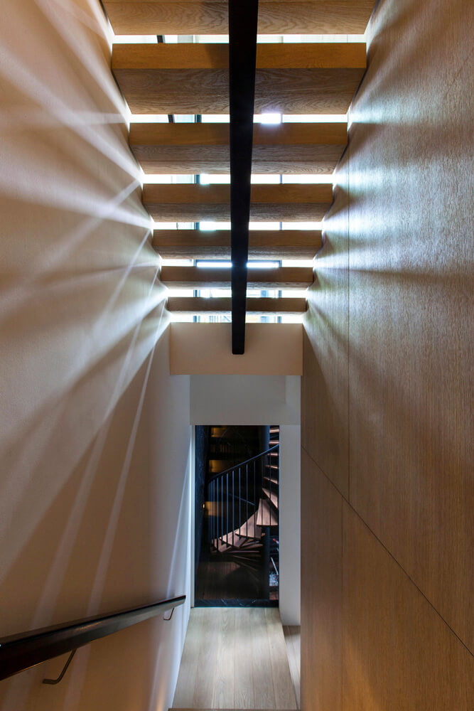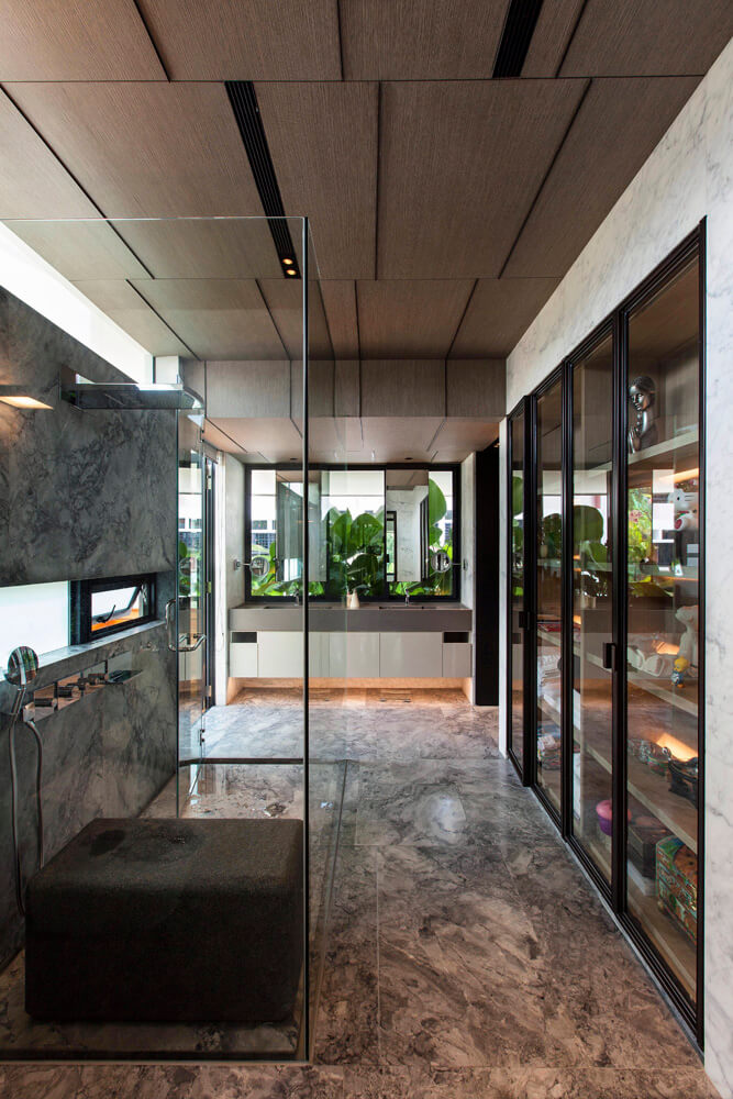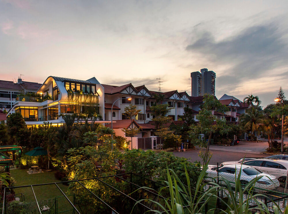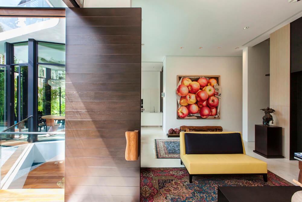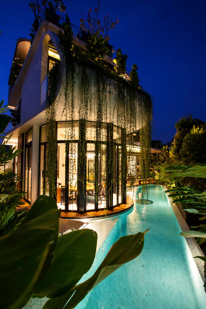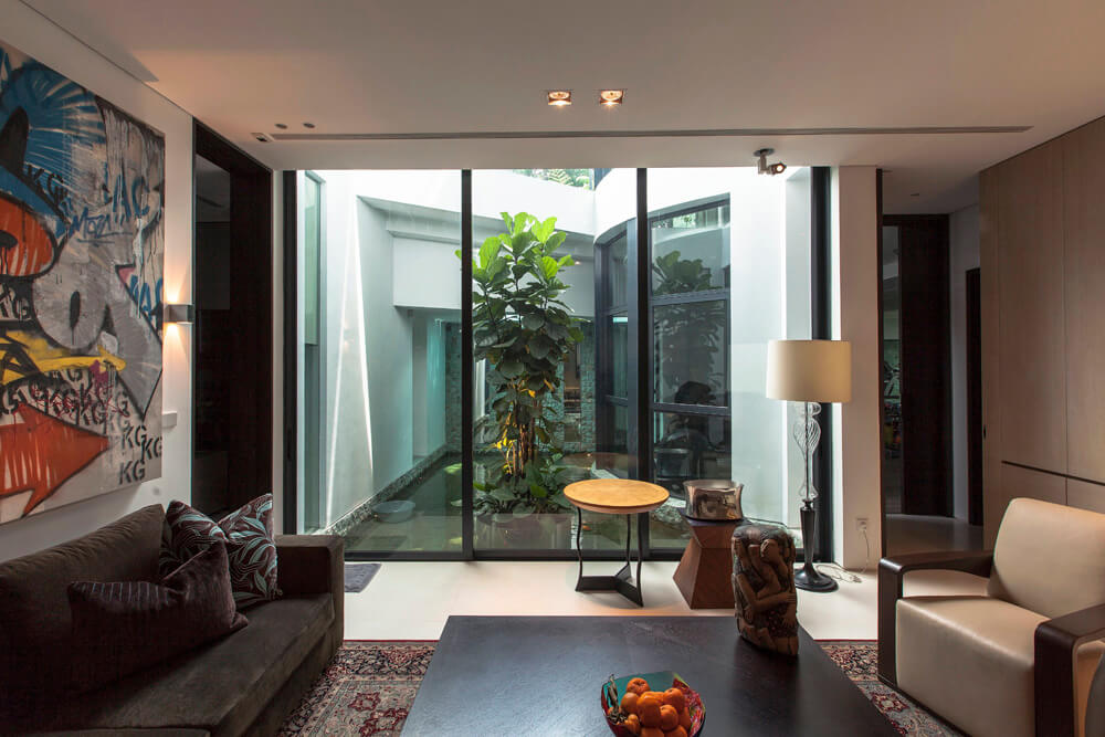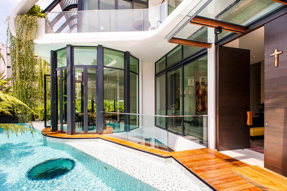 A house in Singapore with a modern interior design by Aamer Architects. The house has a terrace and sits at a corner on a trapezium shaped land with lines. These lines wrap and fold towards distance views while providing privacy from close neighbours. They also achieve a distinctive form that is futuristic and indeed tropical.