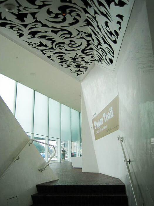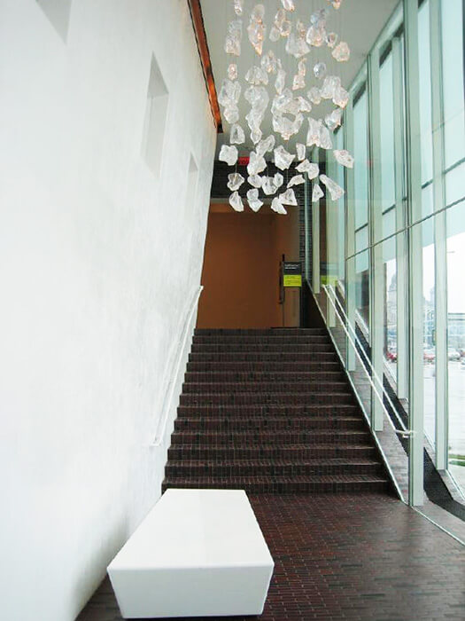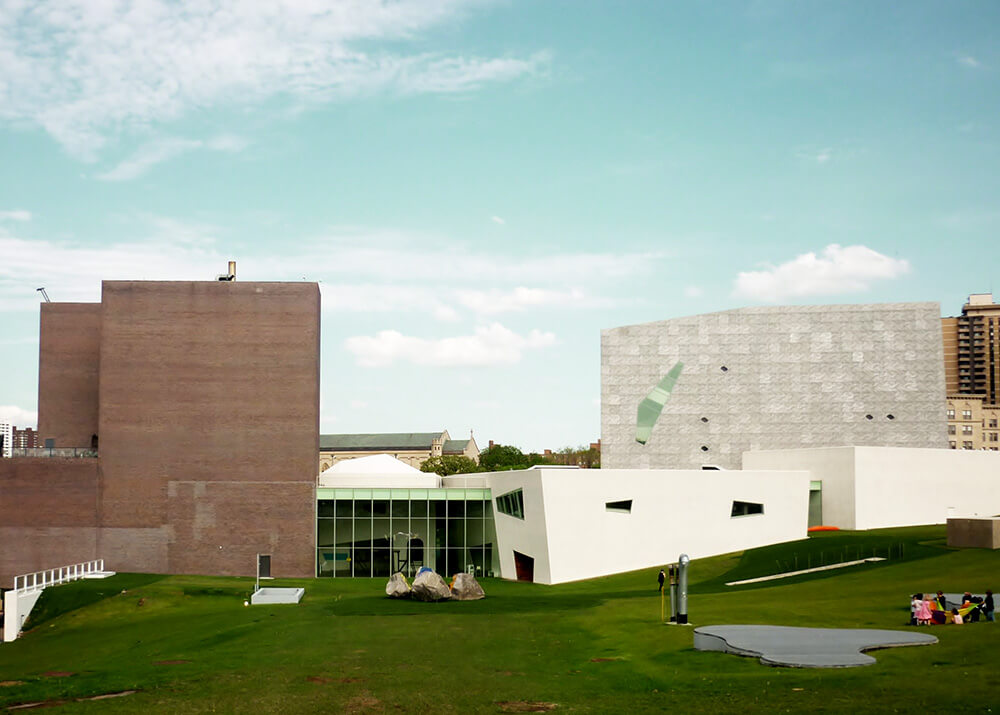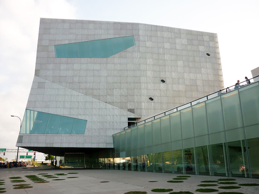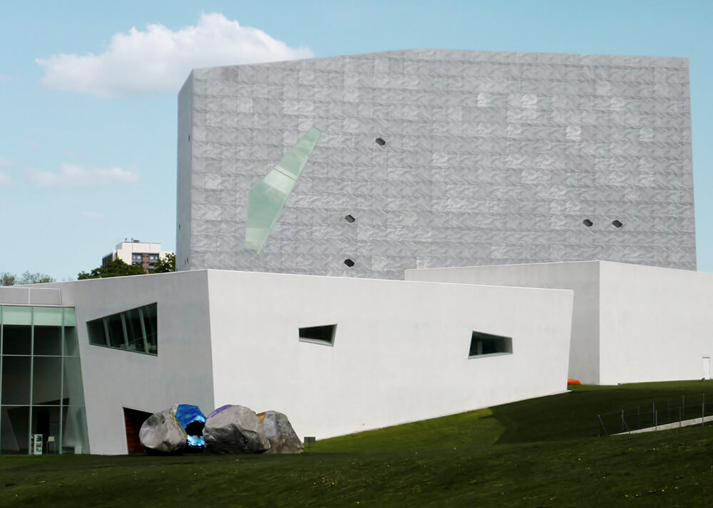 As if tossed out by centripetal force, a series of four skewed, boxlike structures, embedded in a broad glassy passageway, now extend up the hill from the Barnes building. Five stories are rising in the tallest volume where the series culminates and house the art center’s new theater, restaurant, and event space.