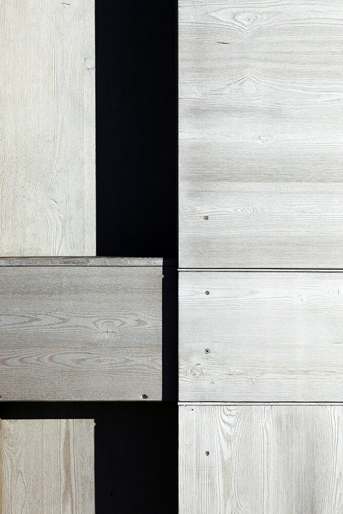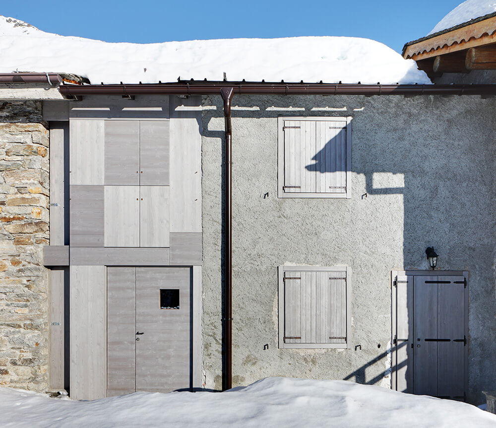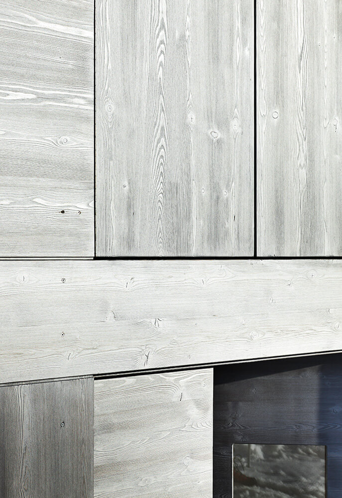 A micro retreat for weekends, a place for contemplation, a clearing house from a daily hectic urban condition. A small wooden box fits between two existing buildings. Inside, the wood shows its nature in warm tones; outside, the surface treatment with silver-gray paints echoes the colors of the centenarian woods of rural buildings. The wooden panels, assembled with different development of the vein (horizontal – vertical), react to sunlight returning different geometric compositions.