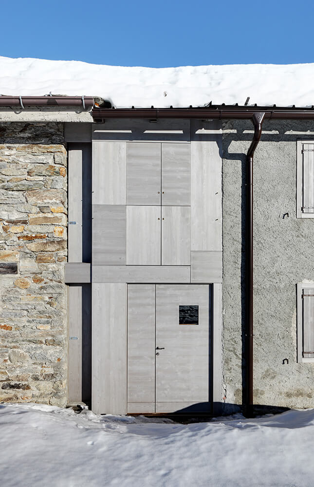 The light that reflects differently on the wooden panels changes the appearance in colors and tones, the uninhabited façade lives of its own life. Finally, the project underlines yet another ambiguity: as a wooden container, as furniture and furnishing, it is “a wardrobe in the landscape”. The project operates in small size, uses simple devices to find a contemporary language within strongly characterized environmental contexts.