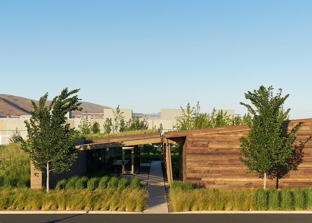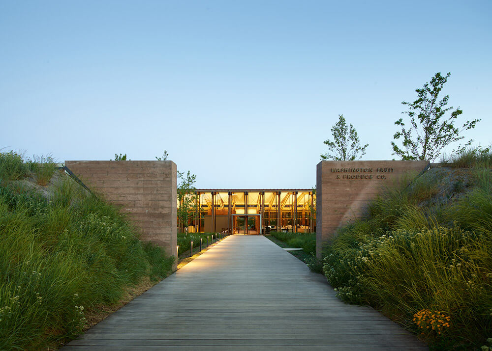 Surrounded by the world’s most high-tech fruit packing warehouses, the 16,500-square-foot Washington Fruit & Produce Co. headquarters is conceived as an oasis amidst a sea of concrete and low-lying brush landscape. Tucked behind landforms and site walls, this courtyard-focused office complex provides a refuge from the noise and activity of the industrial processing yards nearby.