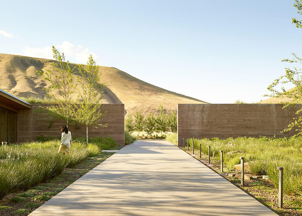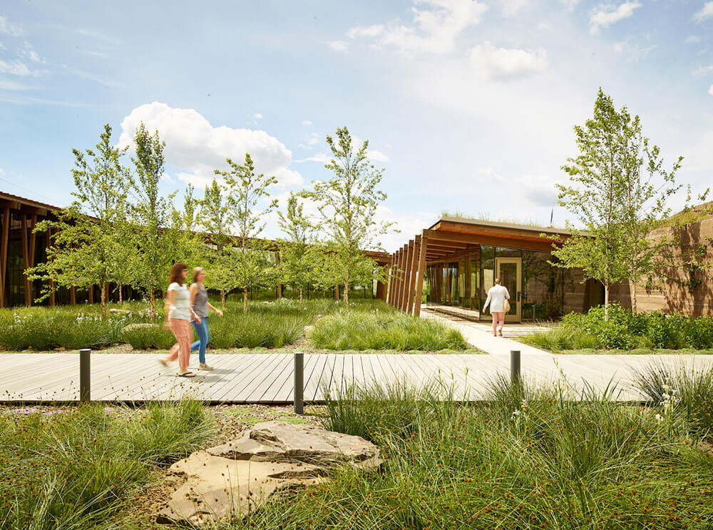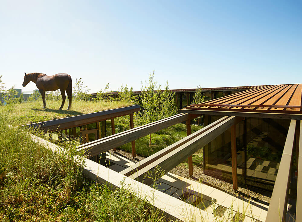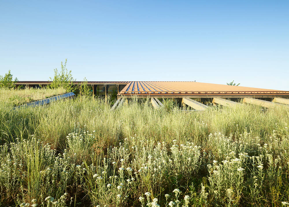 The L-shaped building is nested into the landscape through the use of board-formed concrete site walls and earthen berms that wrap the perimeter to form a central, landscaped courtyard. Soil excavated for foundation work was repurposed for the perimeter berms, eliminating the need to remove it or add more.