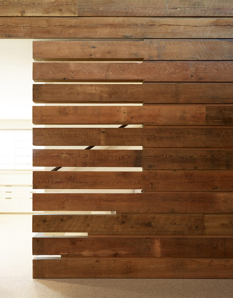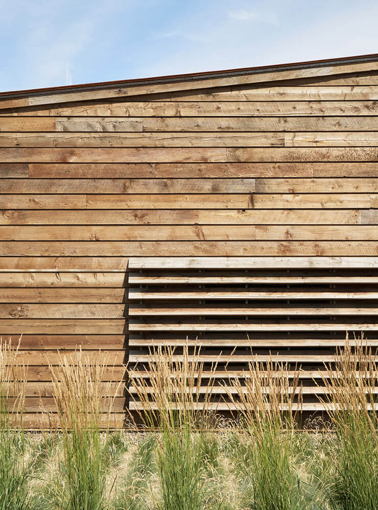 The building recalls its agricultural roots by pulling the 18-foot-tall scissored glu-lam structural columns to the outside, revealing the physics of its construction and enabling the 175-foot-long interior volume to be column free. Topped with 68-foot-long exposed truss girders, the interior reaches 20-feet at its peak. The repetitive nature of the structure ensured easy fabrication and assembly, saving costs and resources. The north-facing courtyard facade is glazed along its length, visually extending the interior space into the courtyard. Interior light is balanced via a long clerestory dormer on the south, while the extensive use of large, south-facing overhangs and high efficiency glazing limits summer heat gain. Reclaimed barn wood siding and a weathering steel roof round out the exterior materials.