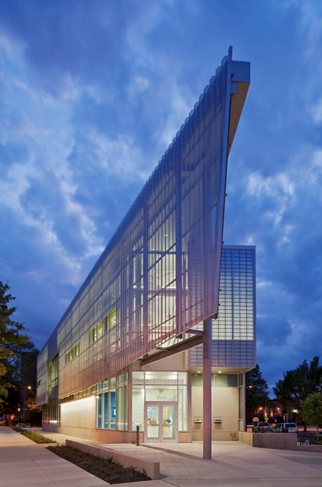 Designed to meet LEED Silver Certification, the Library was designed to include a vegetative green roof, displacement air system, solar control and daylight management and extensive use of recyclable and renewable materials. The building utilizes a corrugated, perforated aluminum screen wall system across its southern facade. The screen wall is three feet in front of an expansive glazed curtain wall, providing sufficient shading of the upper level reading room while allowing natural daylight to enter the space with a 40% open area. The shading system allows a reduced dependence on artificial lighting and its related energy costs as well as protects the Library’s collection from harmful solar exposure.