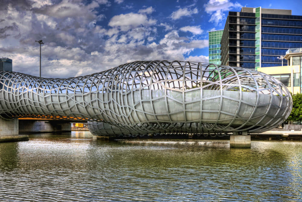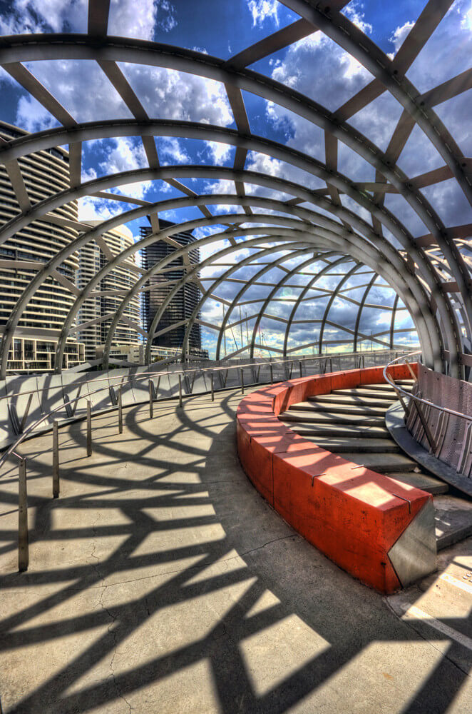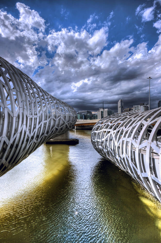 The Webb Bridge in Melbourne by Denton, Corker & Marshall (DCM) pedestrian/cycle bridge over the Yarra River as part of a public art project in Melbourne’s Docklands area. In collaboration with artist Robert Owen.