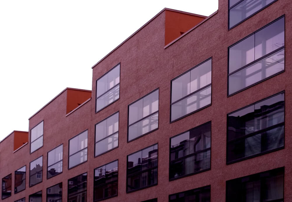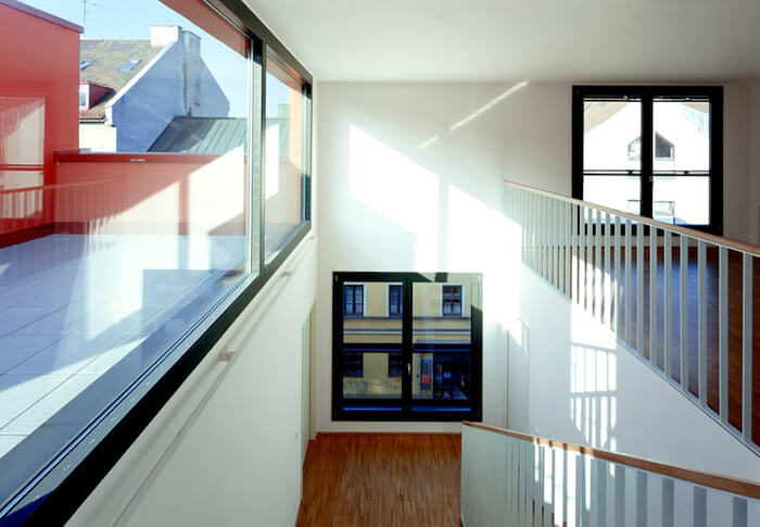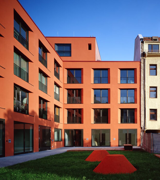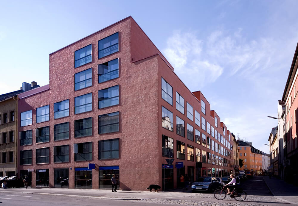 The new construction of this residential and commercial building is an important gesture in Munich’s up-and-coming neighbourhood Westend. The building, with its bright red façade occupies a prominent urban location on a busy street. The building takes the place of five old buildings that used to stand in its area whose conservation was no longer economical. Seven stores, a common room and 23 apartments of different sizes were created. 17 apartments with loggias and six maisonette apartments with double story spaces and roof terraces. Exterior walls and stairway cores are where the load carrying structure of the house is reduced. The entire interior construction consisting of lightweight walls allows for adjustment according to the resident and coming changes in the housing market. The house is fully wheelchair accessible.